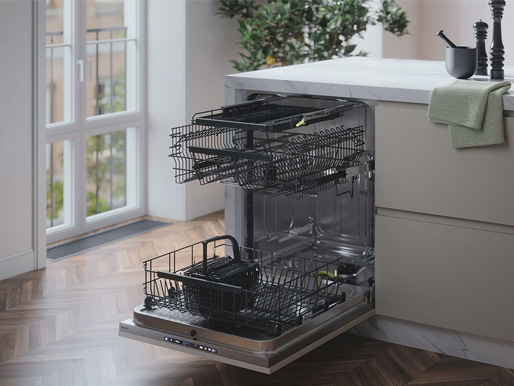 Diskmaskinen är utrustad med tre korgar som kan justeras, flyttas och anpassas efter behov. Den avtagbara översta bestickbrickan har egen sprayarm och kan höjdjusteras för att skapa mer utrymme i de nedre korgarna, vilket ger maximal flexibilitet vid varje diskning.