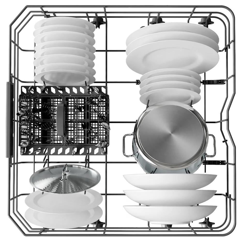 Den justerbara övre korgen gör det enkelt att skapa extra utrymme när större kastruller eller höga glas ska diskas. Det flexibla glasskyddet hjälper till att hålla känsliga föremål stabila under hela diskcykeln.