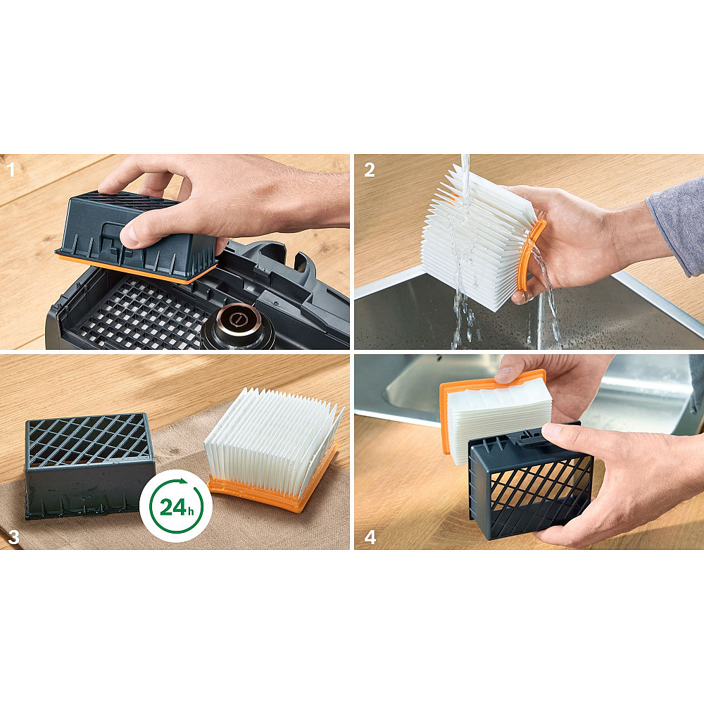 Bosch HEPA hygienfilter tillverkat i Tyskland filtrerar bort upp till 99,95 % av små partiklar, bakterier och föroreningar. Det gör luften renare än den du andas utomhus - perfekt för allergiker. Filtret är dessutom tvättbart för bättre hållbarhet, och hållaren är tillverkad av 100 % återvunnen plast. När det är dags att byta räcker det att ersätta själva filtret.