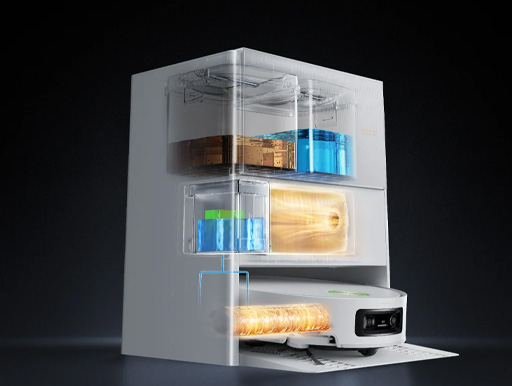 Den självrengörande basstationen tar hand om allt underhåll automatiskt. Mopprullen tvättas och torkas med varm luft vid 70 grader, och dammet töms i en 3,2 liters dammpåse som räcker i upp till hundra dagar. Basstationen justerar tvättiden utifrån smutsnivå, fyller på vatten och rengöringsmedel och eliminerar dålig lukt med ett särskilt fack för husdjursluktlösning.