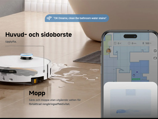 Med ett enkelt kommando, “OK Dreame”, kan du starta, pausa eller anpassa städningen utan att ta fram telefonen. Robotdammsugaren kan även styras via appen med alternativ för att välja specifika rum, torrmoppning eller att återvända till dockningsstationen. Röststyrningen finns tillgänglig på flera språk och gör det enkelt att styra städningen helt handsfree.