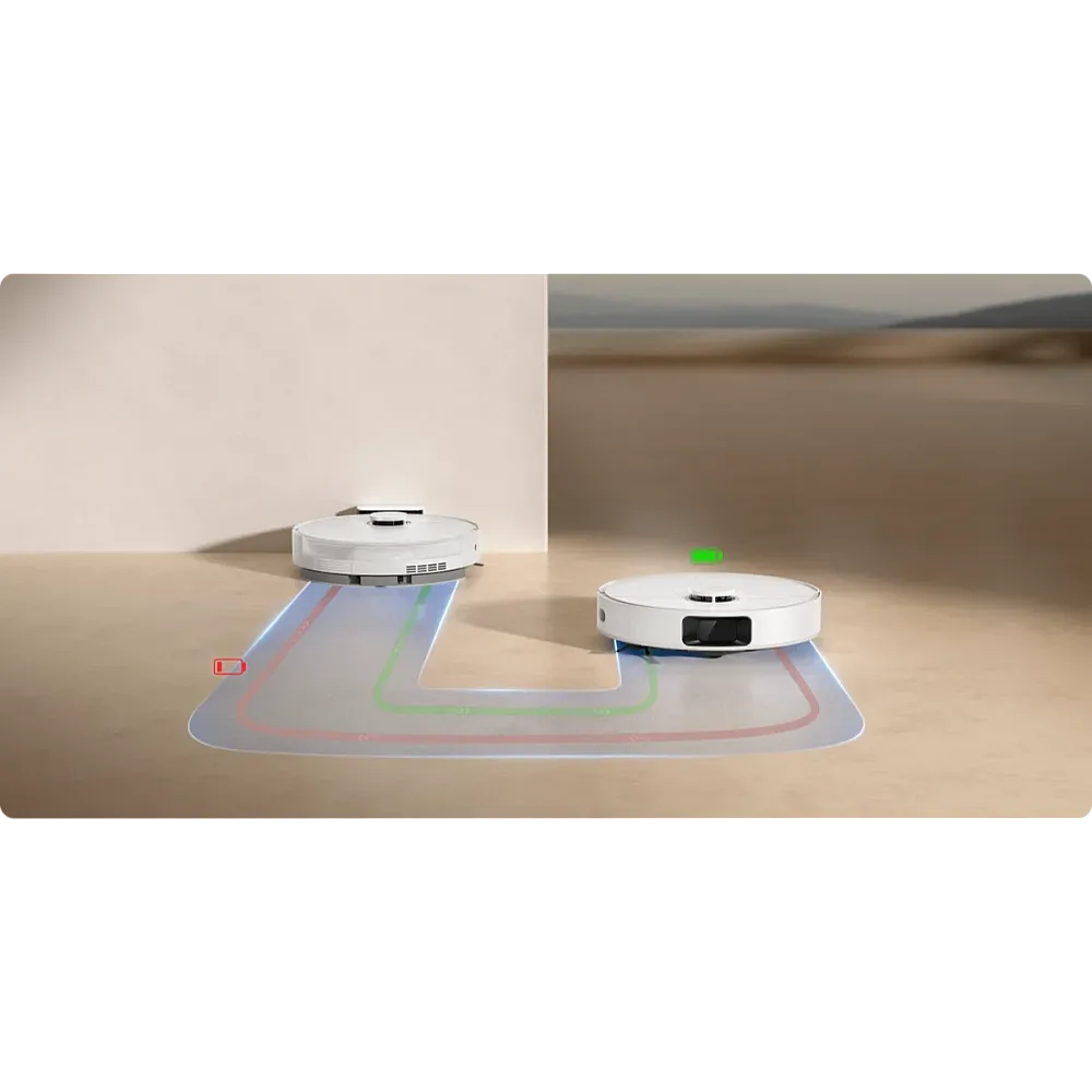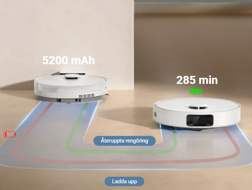 Dreame D20 har ett kraftfullt 5200 mAh-batteri som ger upp till 285 minuters drifttid. När batterinivån blir låg återvänder roboten automatiskt till sin laddningsstation och fortsätter där den slutade efter uppladdning. Det betyder att du alltid får en komplett städning utan att behöva lyfta ett finger.