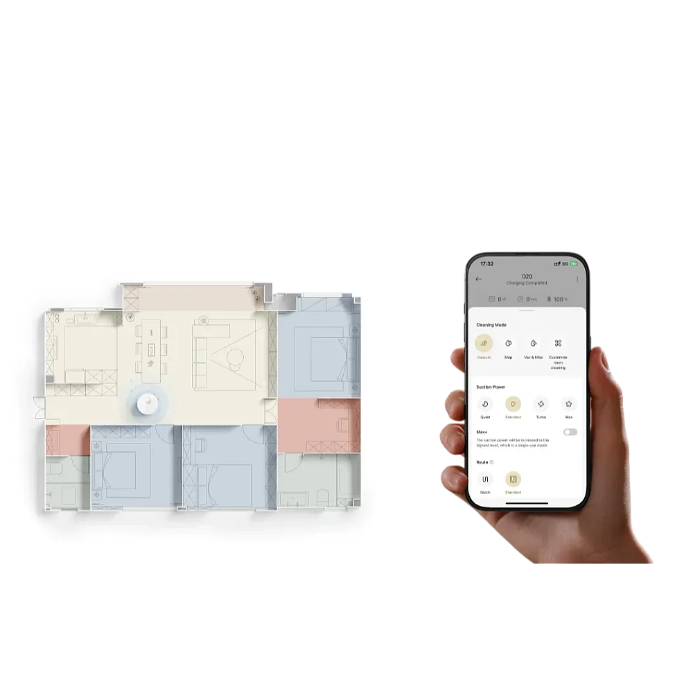 Med Dreamehome-appen kan du planera, schemalägga och anpassa rengöringen efter varje rum och behov. Justera sugeffekt, vattennivå och städområden direkt via mobilen. D20 är dessutom helt kompatibel med röststyrning via Google Assistant eller Alexa-så du kan starta städningen med ett enkelt kommando.