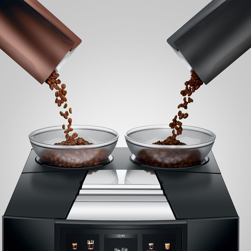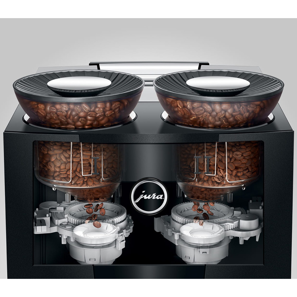Den avancerade Jura GIGA 10 är utrustad med inte bara ett, utan två högkvalitativa keramiska malverk som säkerställer långvarig prestanda och optimal smakupplevelse. De två separata bönbehållarna, med en stilren turbindesign och ett eget malverk för varje behållare, gör det möjligt att välja den perfekta kaffeblandningen för varje kopp.