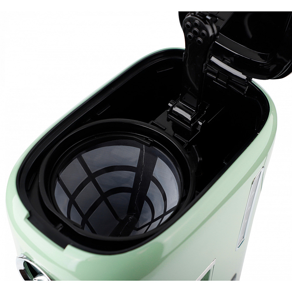Den retroinspirerade designen i pistagegrön färg kombineras med praktiska detaljer som glaskanna med bekvämt handtag och tydlig vattennivåindikator. det återanvändningsbara och avtagbara filtret gör bryggningen både smidig och miljövänlig.