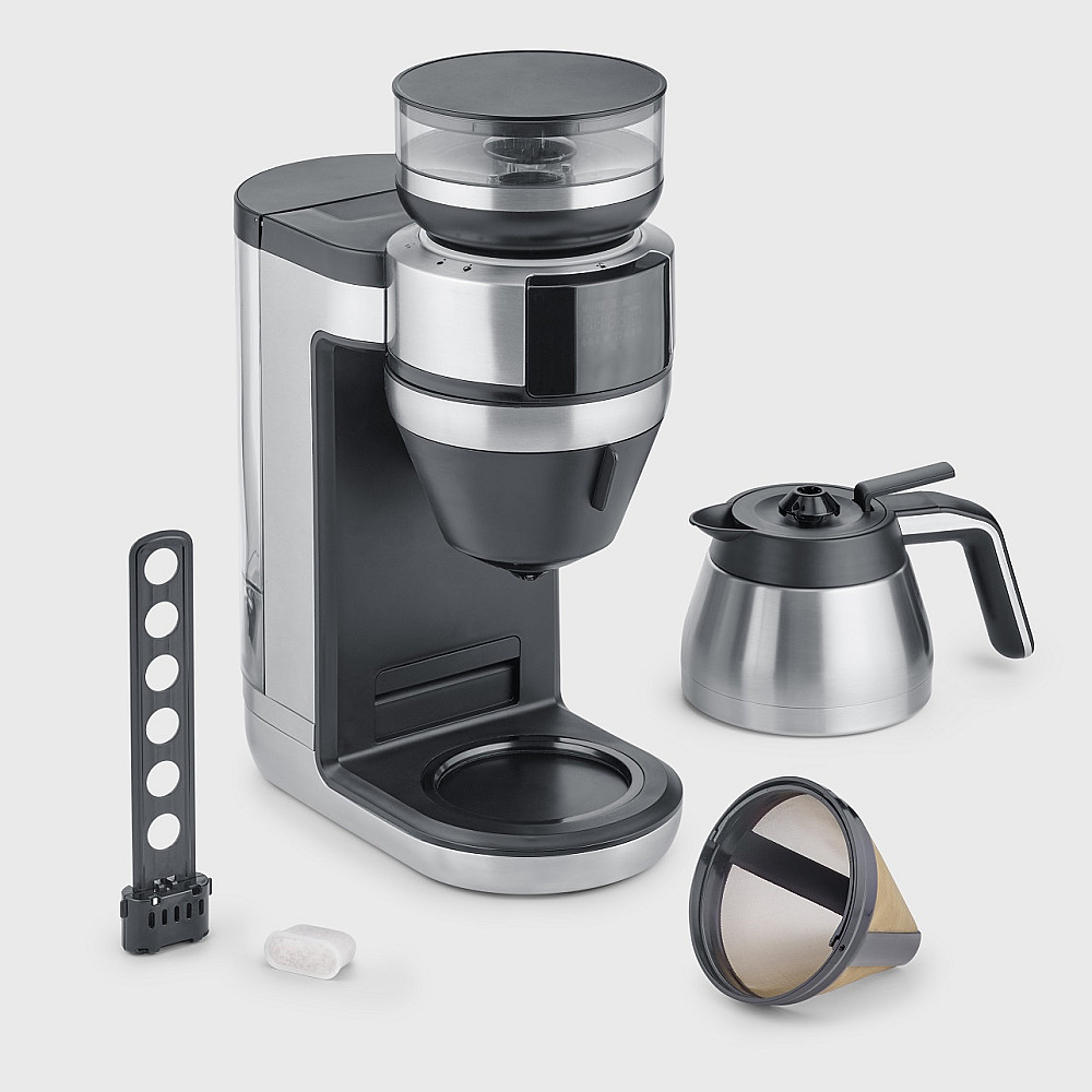 Den tystgående kvarnen maler bönorna med perfekt balans och doserar sedan vattnet från den generösa vattentanken på 2 liter. Med en bryggtemperatur på 96°C får du ett rykande hett och smakfullt kaffe direkt i koppen, muggen eller termoskannan. Bryggaren erbjuder även möjlighet att använda färdigmalet kaffe om bönorna skulle ta slut.