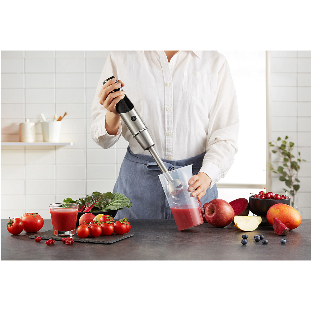 Med sitt smarta tillbehörspaket inklusive minihackare, visp, majonnäsvisp och två praktiska behållare - blir matlagningen både snabbare och smidigare. Bladfäste och vispar tål dessutom diskmaskin, vilket gör rengöringen enkel.