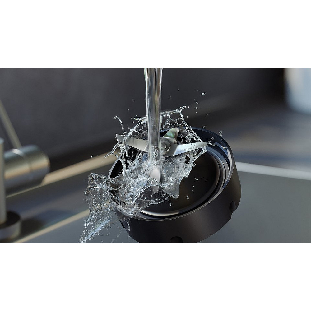 Den kraftfulla 1500 watt ProBlend Ultra-motorn cirkulerar ingredienserna jämnt, eftersom den kombinerar tre funktioner som är skräddarsydda för att fungera perfekt tillsammans och för att erbjuda mångsidiga smaker och texturer precis som du vill ha dem varje gång. Enhetens knivar kombinerar tandade knivar för krossning av hårda material med vassa knivar för fin kapning. Efter användning är enheten lätt att rengöra tack vare dess rengöringsfunktion och att delarna tål diskmaskin. Bara tillsätt en liten mängd vatten och diskmedel till enheten, starta rengöringsfunktionen och njut av enkel rengöring på bara två minuter. Rengöringsfunktionen tar bort även de mest envisa resterna, som kaksmet och nötsmör. Ladda ner och utforska Philips NutriU appen, som har över 200 idéer för att göra dina favoritdrycker, måltider och snacks med din nya mixer. Hälsosam matlagning ska vara enkel och attraktiv, därför erbjuder NutriU-appen ett brett utbud av hälsosamma versioner av din favoritmat. Från hälsosamma chokladdesserter till näringsrika måltider, våra recept är hälsosamma utan att kompromissa med smaken.