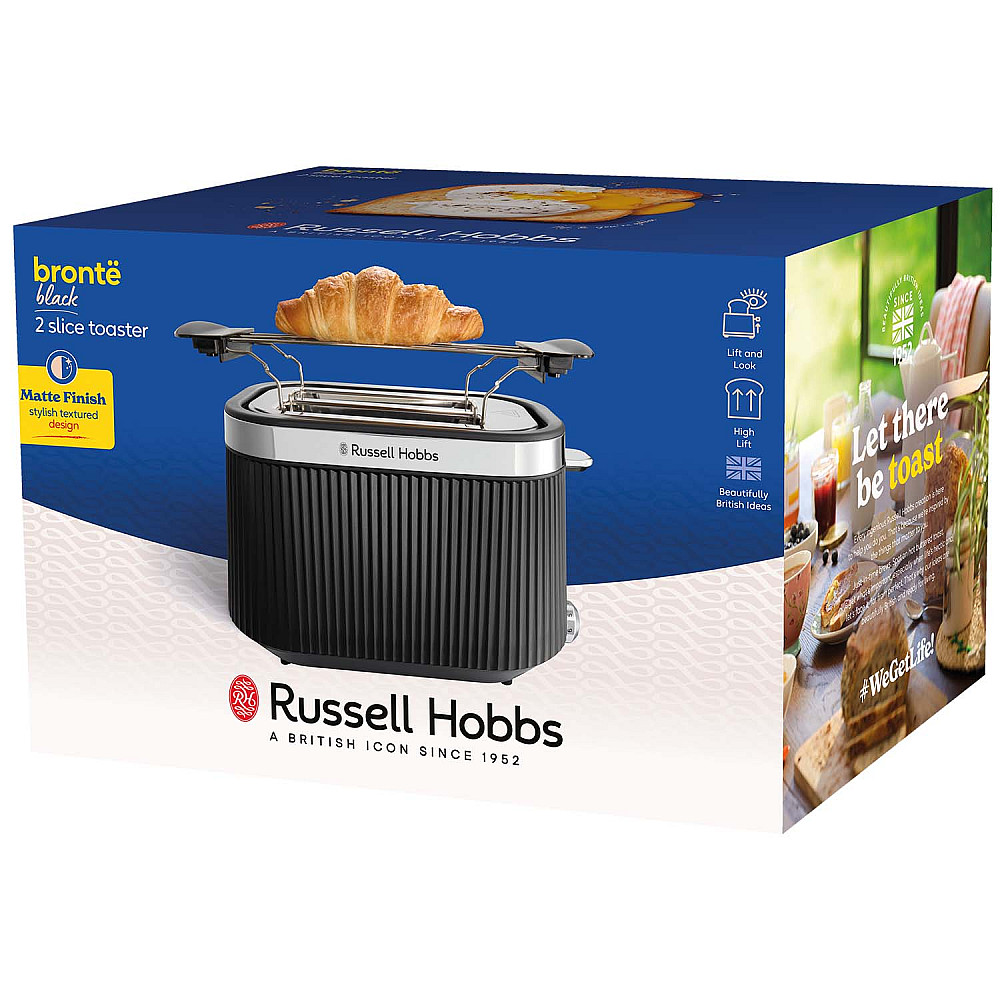 Ett elegant matt svart räfflat yttre möter borstade detaljer i rostfritt stål och gör Russell Hobbs Brontë tvåskivstoaster till ett stilrent tillskott i köket. Designen kombinerar modern elegans med praktisk funktionalitet och lyfter både uttryck och användarvänlighet. Med Lift and Look funktionen kan du kontrollera rostmängden utan att avbryta cykeln och med den höga lyftfunktionen får du enkelt upp även små bröd som bagels utan att riskera att bränna dig.