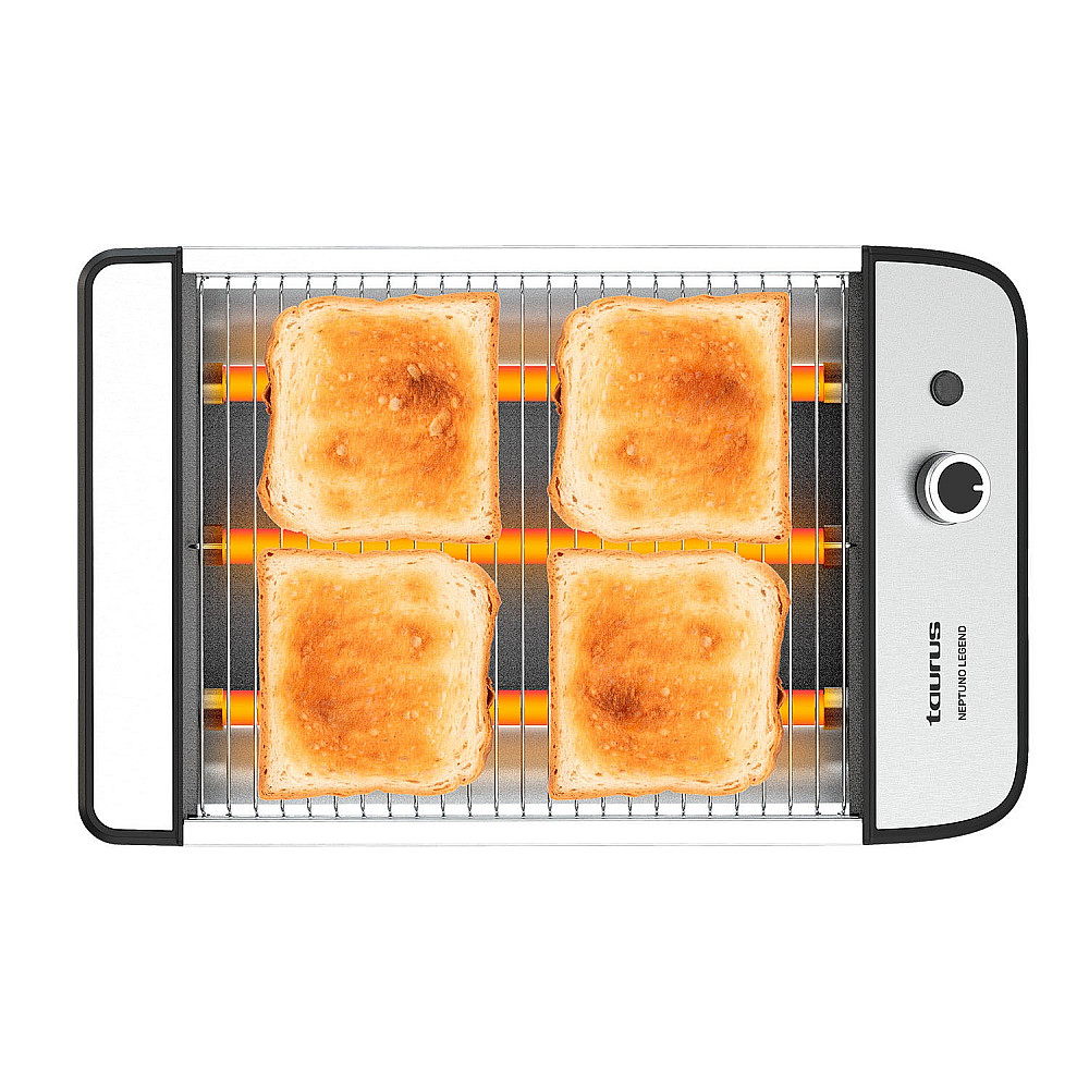 Effektiv Taurus Neptuno Legend är en platt brödrost med 1000 W effekt och tre kvartsvärmare som ger snabb och jämn rostning av bröd, smörgåsar och bakverk.
