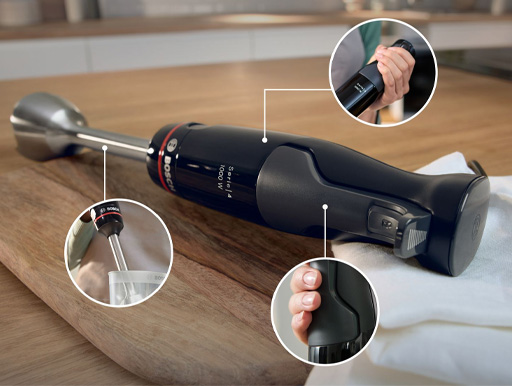 ErgoMaster är utformad för att ligga perfekt i handen med ett halkfritt grepp som ger stabilitet och kontroll. Den låga vikten gör att handen inte blir trött, även vid längre användning. Tack vare klickfästet tas mixerfoten enkelt loss för rengöring under vatten eller i diskmaskin. På så vis sparar du tid och håller mixern fräsch till nästa användning.