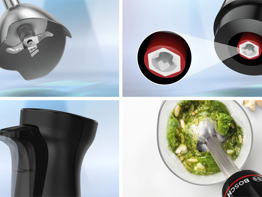 De fyra bladen i rostfritt stål är designade för att ge jämn blandning och en len konsistens vid varje användning. QuattroBlade-systemet säkerställer effektiv bearbetning även av hårda ingredienser. Den specialformade mixerklockan med AntiSplash-teknik förhindrar stänk och håller köket rent - samtidigt som du får en perfekt, klumpfri blandning.
