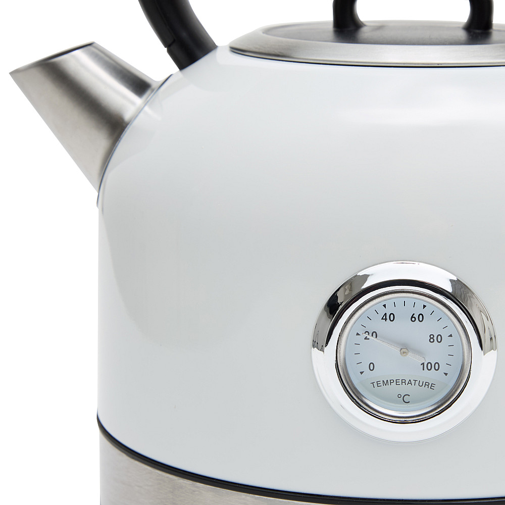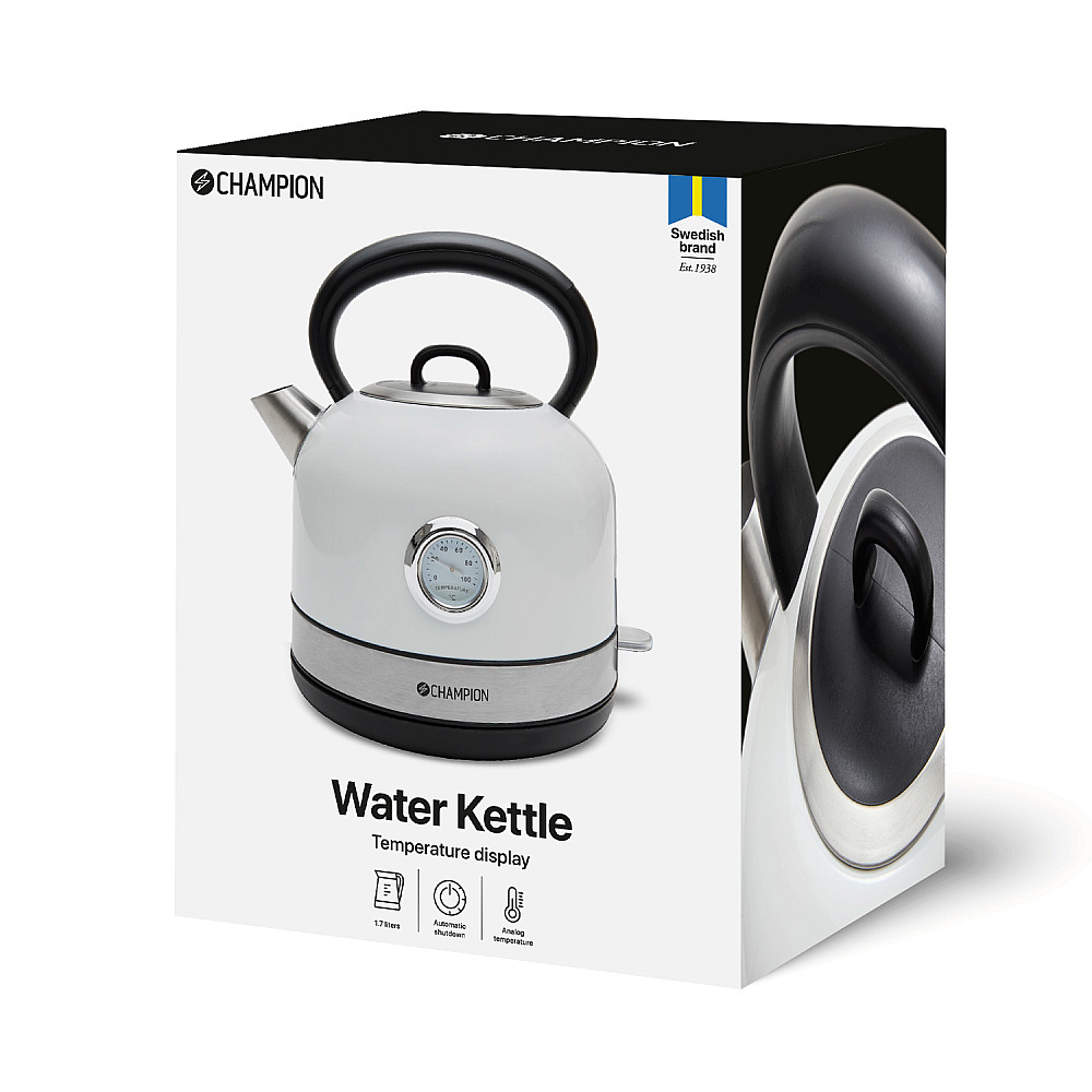 Modellen är tillverkad i rostfritt stål och har en analog temperaturvisare på sidan samt en generös kapacitet på 1,7 liter, vilket gör den perfekt för både vardagsbruk och större sällskap.