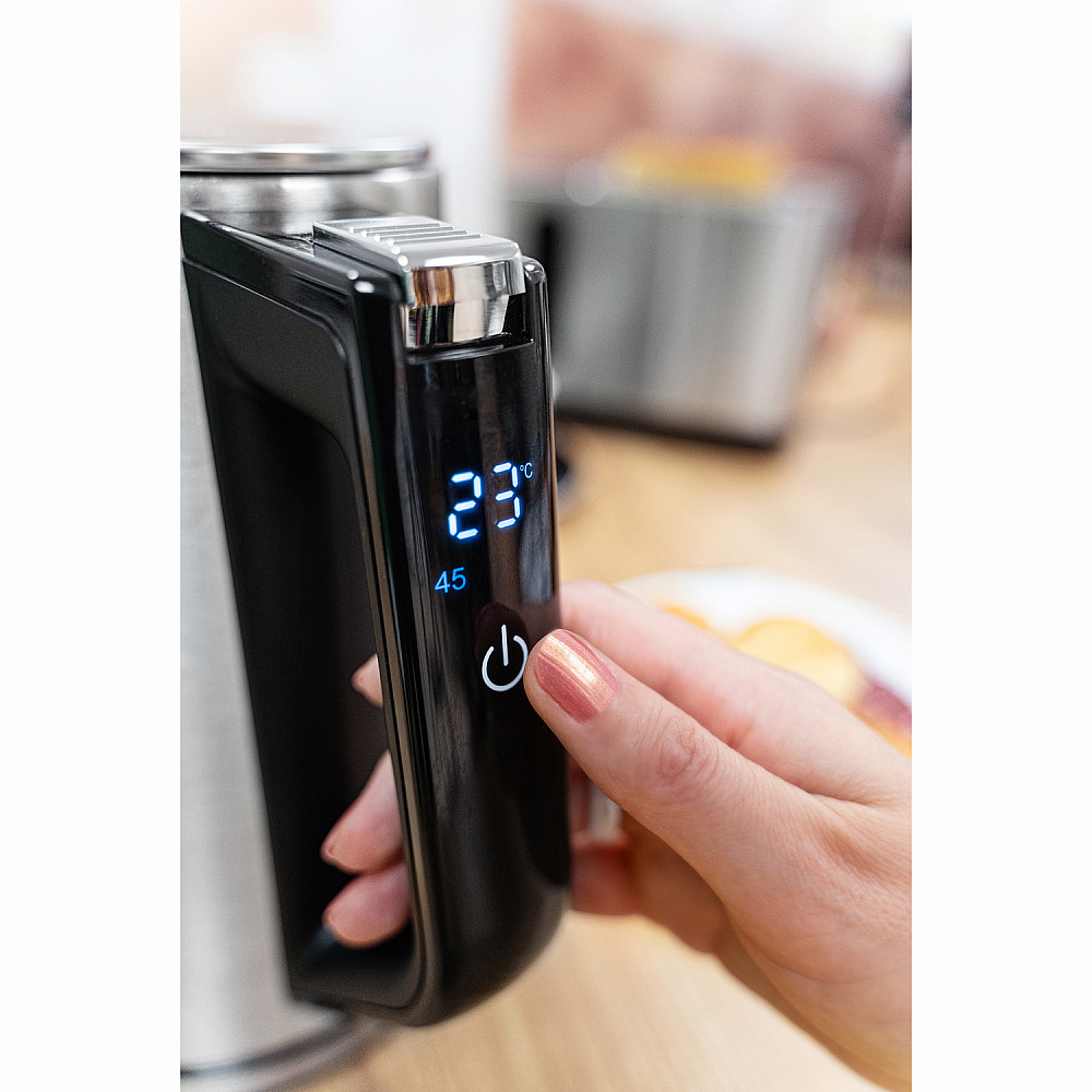 Den ergonomiska utformningen gör vattenkokaren enkel att använda med LED-display och reglage placerade direkt på handtaget. Den breda påfyllningsöppningen, nivåindikatorer på båda sidor och ett löstagbart filter i rostfritt stål ger en smidig och hygienisk användarupplevelse.