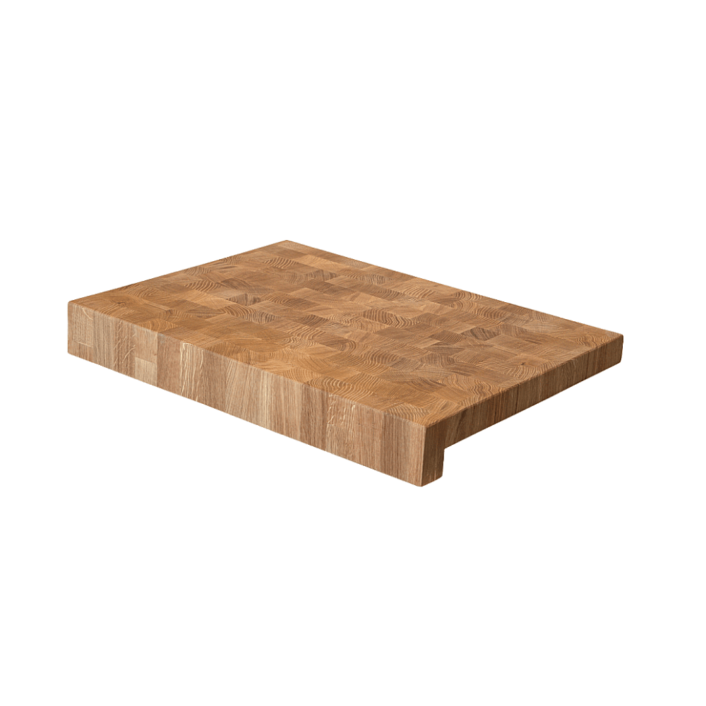 Tillverkad i massiv ek av ändträ för skonsam knivkontakt