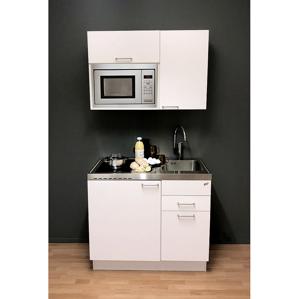 Den rostfria diskbänken är utrustad med en diskho och finns i både höger- och vänsterutförande beroende på rummets utformning. Det integrerade kylskåpet har ett praktiskt köldfack för enklare frysbehov. Den moderna touchstyrda hällen har två effektiva värmezoner (1200 W + 1800 W), strömindikator i 9 steg, samt timerfunktion från 1 till 99 minuter.