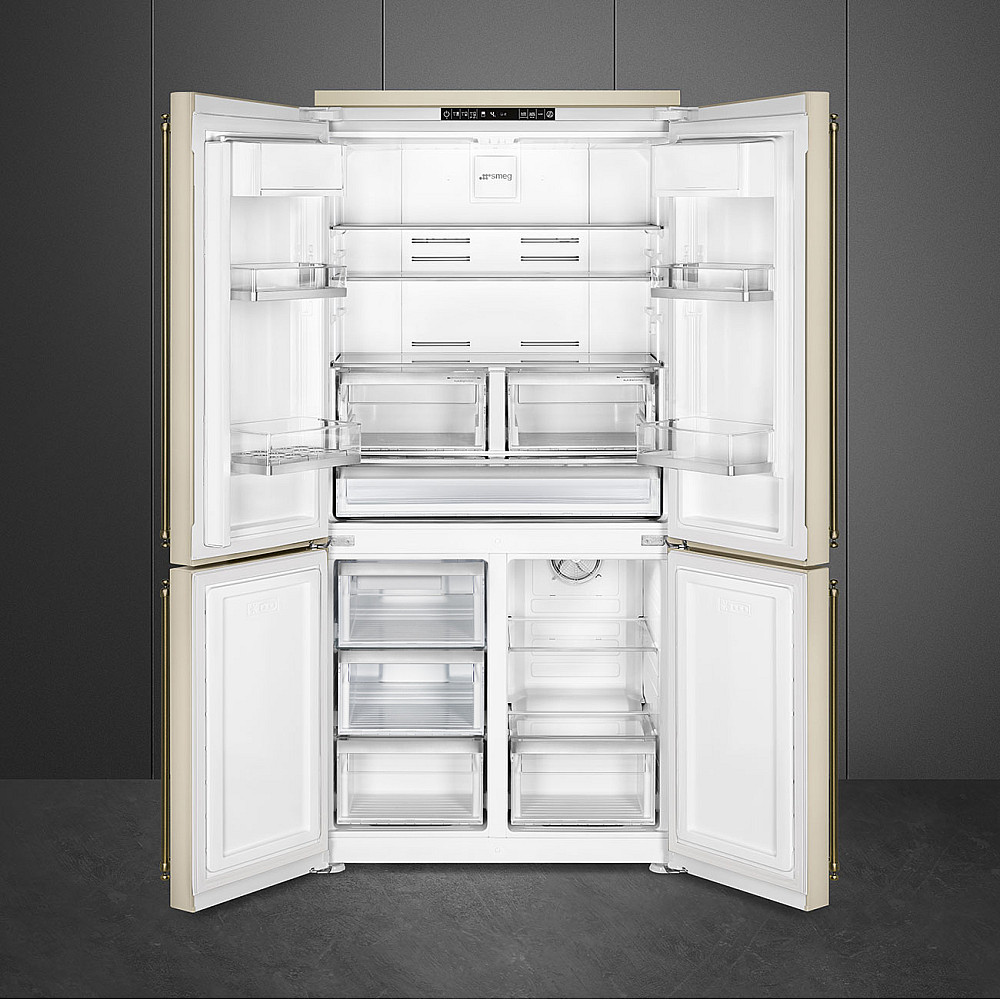 Upplev Smeg French Door kylskåp i en stilren cremefärg med Colonial estetik, där elegant design förenas med avancerad funktionalitet för ditt kök. Detta fristående 4-dörrars kylskåp är utrustat med Total No Frost-teknik, vilket eliminerar behovet av manuell avfrostning och säkerställer att både kyl och frys hålls i optimal temperatur, vilket förlänger hållbarheten på dina livsmedel. LCD-displayen ger dig enkel åtkomst till inställningar och optimerar apparatens prestanda. Med en Life Plus 0 °C-zon bevarar du kött och fisk i bästa skick genom att hålla en konstant temperatur på 0 °C. Det ventilerade kylsystemet med Air Plus garanterar en jämn temperatur över hela kylutrymmet, och Natural Plus Blue Light förlänger fräschheten hos frukt och grönsaker. Inuti har kylskåpet två justerbara glashyllor och två frukt- och grönsakslådor med kromprofiler, medan frysdelen erbjuder fyra lådor och två glashyllor med en snabbfrysningsfunktion för extra snabb nedkylning. Med en total volym på 572 liter, där kyldelen har 376 liter och frysdelen 196 liter, samt en energiklass E och en tyst drift på endast 37 dB(A), är detta kylskåp ett energieffektivt och stiligt val för det moderna hemmet. Smeg French Door kylskåp kombinerar klassisk estetik med smart teknik, vilket gör det till en perfekt mittpunkt i ditt kök.