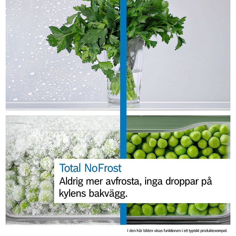 Slipp avfrostning helt: Med Total No Frost teknik behöver du aldrig frosta av frysen. Systemet förhindrar isbildning och minskar fukt i både kyl och frys vilket ger bättre hygien och energieffektiv drift.