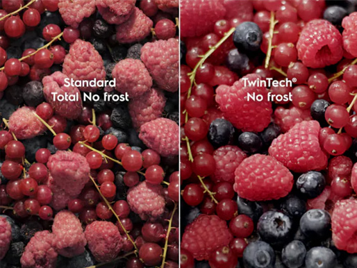 TwinTech No Frost använder ett dubbelt kylsystem där kyl och frys arbetar separat. Detta gör att rätt luftfuktighet bevaras i kylen samtidigt som frysen hålls helt fri från frost, vilket ger bättre förutsättningar för längre hållbarhet.