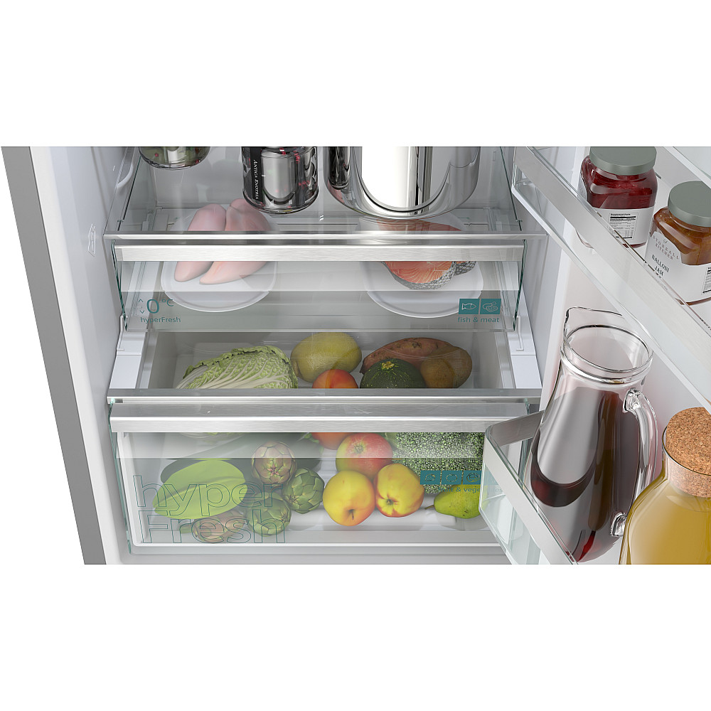 Flexibel förvaring med hyperFresh. hyperFresh 0 °C lådan skapar optimala förhållanden för färska råvaror. Med reglerbar luftfuktighet hålls frukt och grönsaker krispiga längre, samtidigt som ett separat kallfack ger rätt temperatur för kött och fisk.