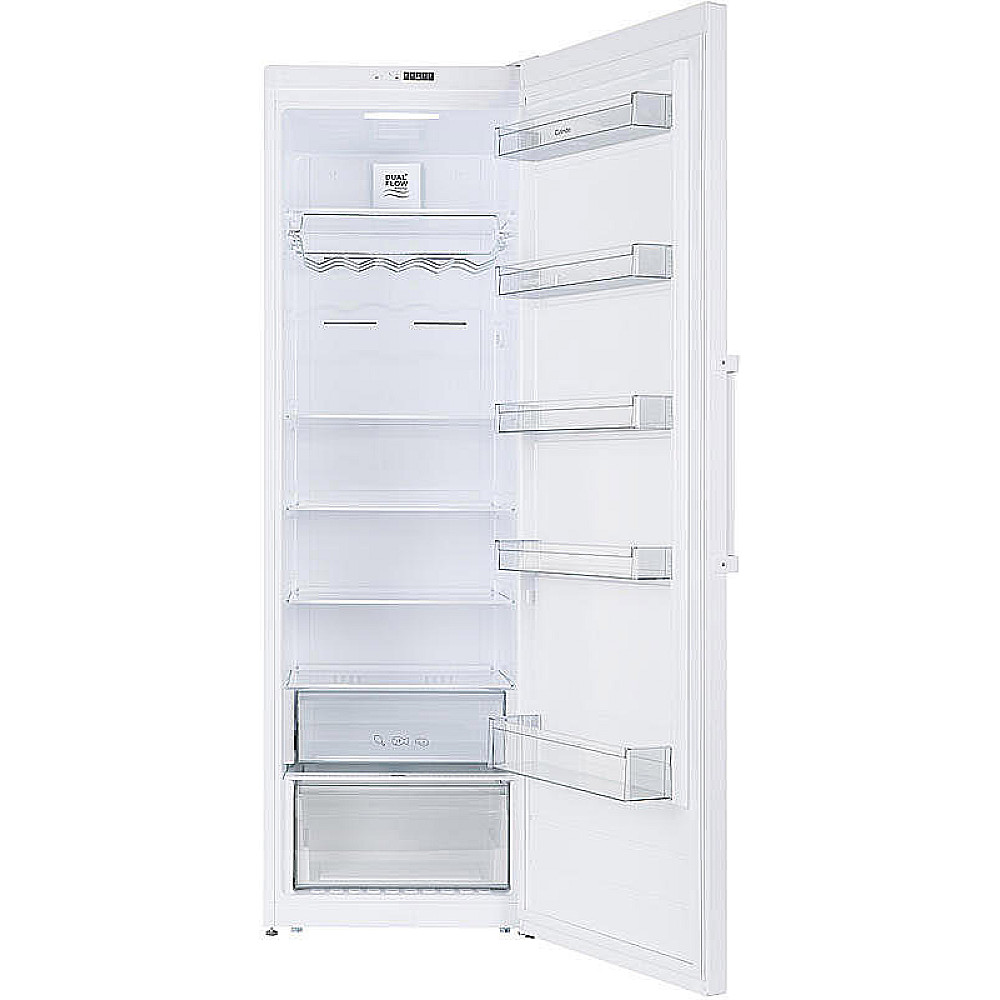Rymligt kylskåp med stabilt metallhandtag. Genom Dual flow-teknik sprids kylan jämnt och ger rätt luftfuktighet i hela skåpet, vilket är bra framförallt för lite känsliga livsmedel som till exempel grönsaker. Stora rymliga hyllplan och effektiv LED-belysning. En speciellt anpassad zon för fisk och kött förvaring. Dörrarna omhängningsbara.