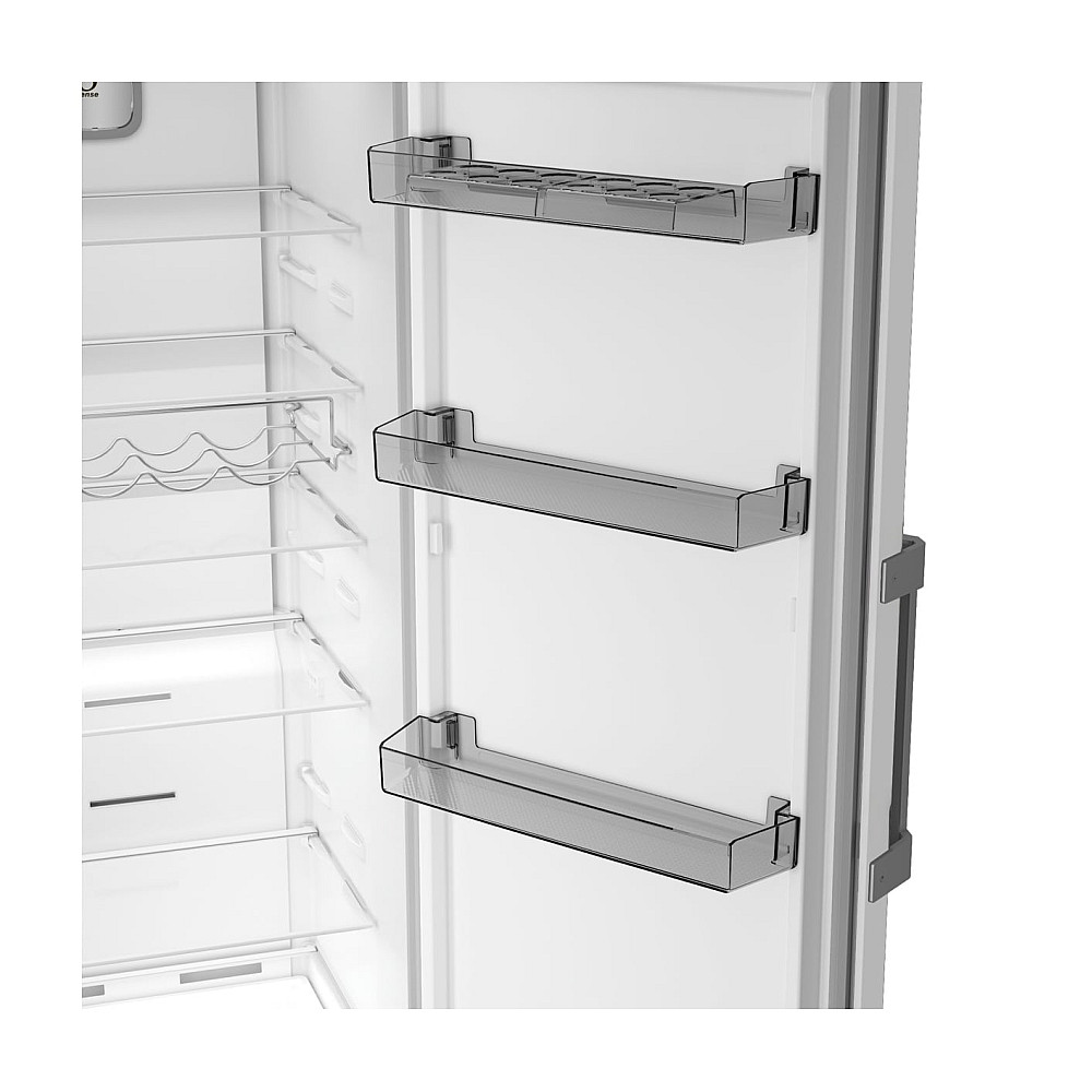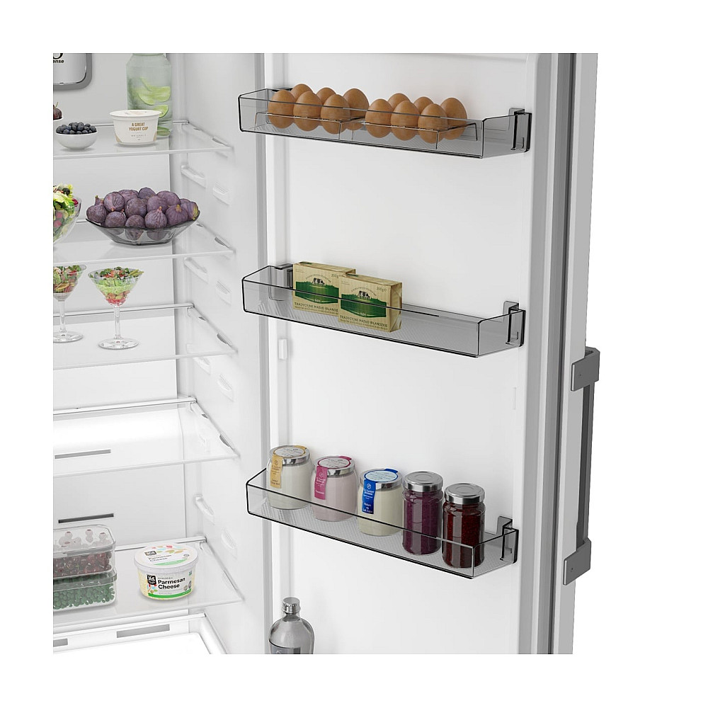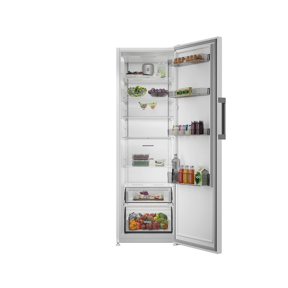 Stilren och genomtänkt design: Den vita dörren med metallhandtag ger ett elegant uttryck som passar de flesta kök. Med ett fällbart flaskställ blir det enklare att organisera drycker eller större varor, medan dörrlarmet hjälper till att skydda både mat och energi.