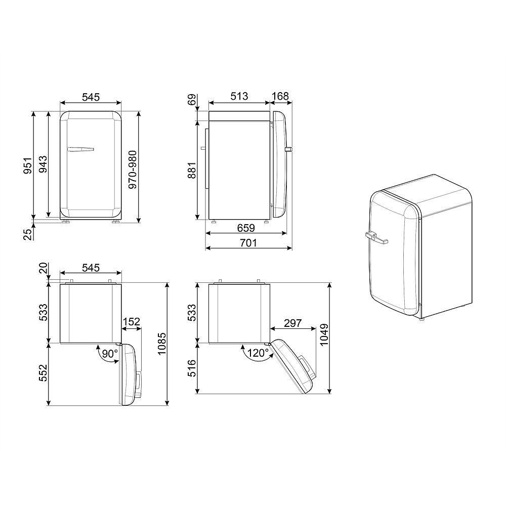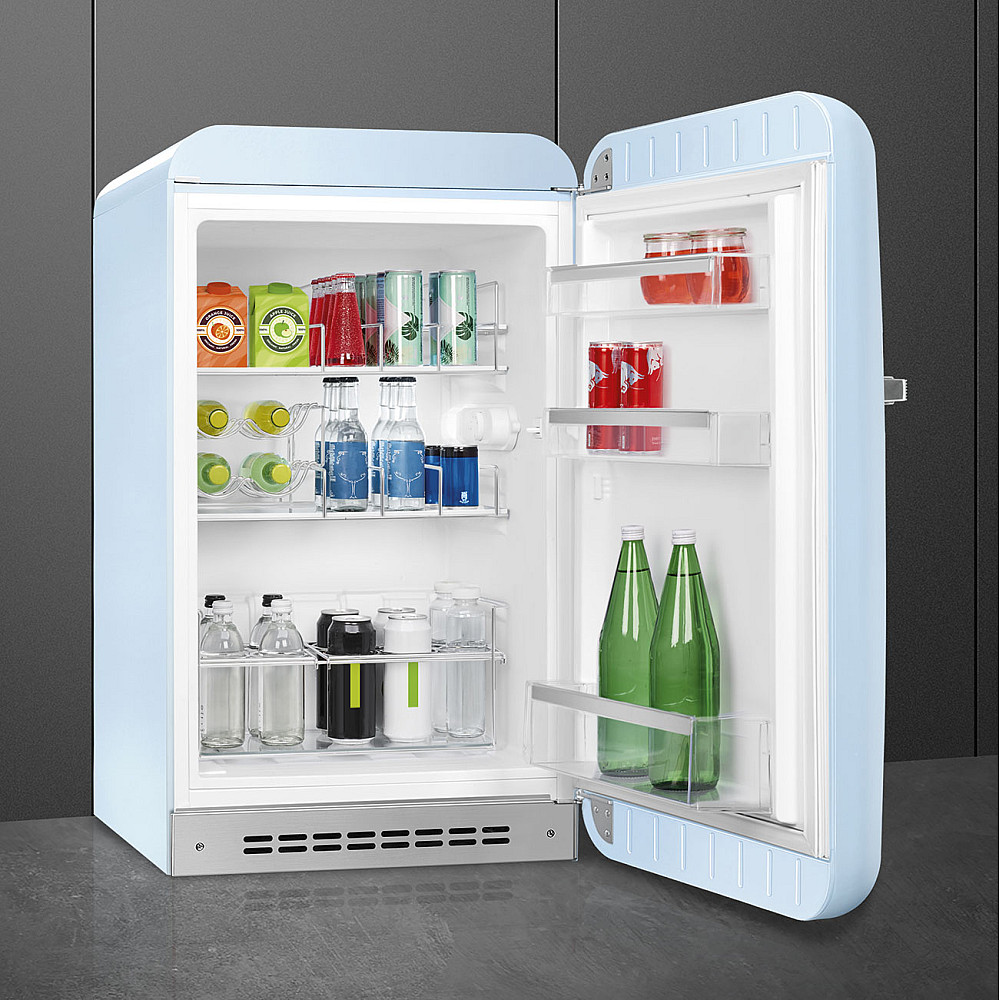 En färgstark designklassiker. Denna minibar i pastellblått från Smeg kombinerar ikonisk 50 tals estetik med modern funktion. De mjuka, rundade linjerna och det kromade handtaget skapar ett elegant blickfång som passar perfekt i vardagsrum, kontor eller hemmabar.