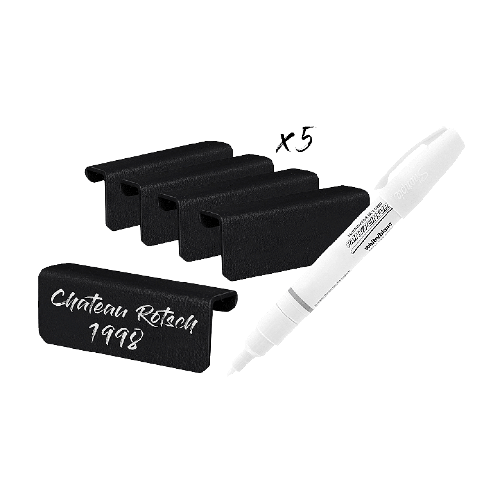 Stilren märkning med flexibel användning. Etiketterna är tillverkade i svartlackerad plåt och ger ett exklusivt intryck i skåpet. Med den medföljande vita glaspenna kan du enkelt skriva namn, druva eller årgång direkt på etiketten och uppdatera informationen vid behov.