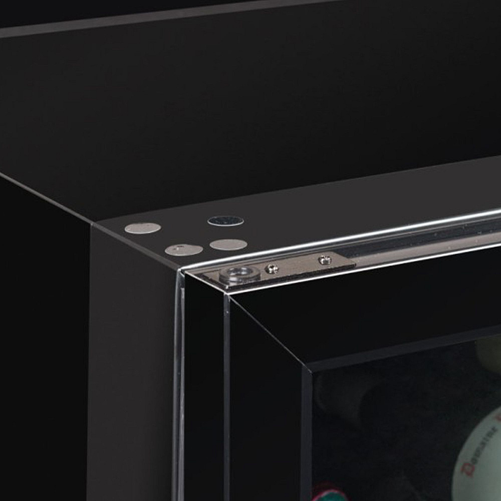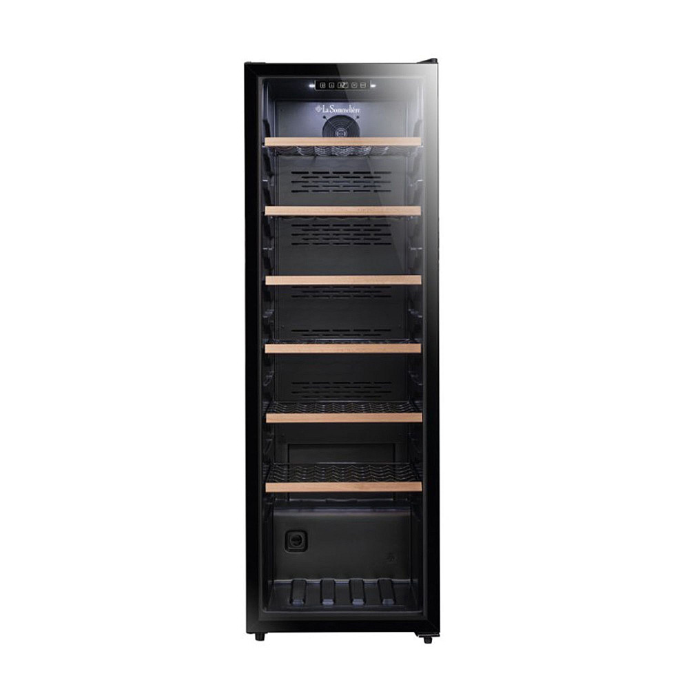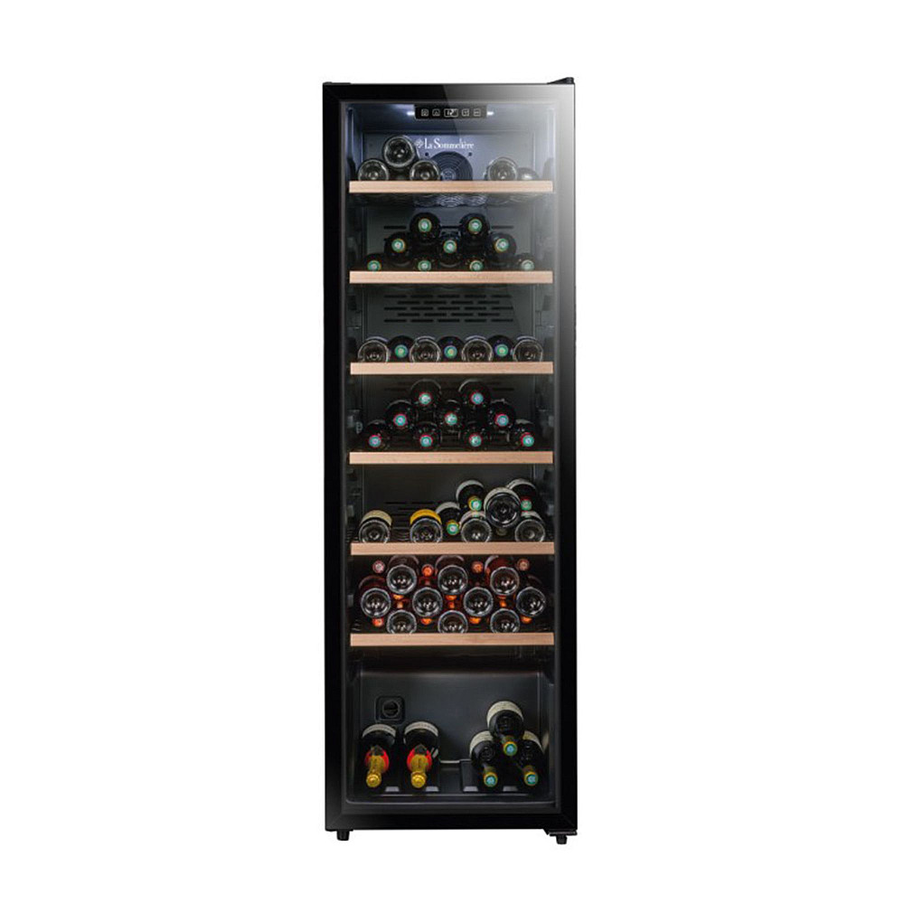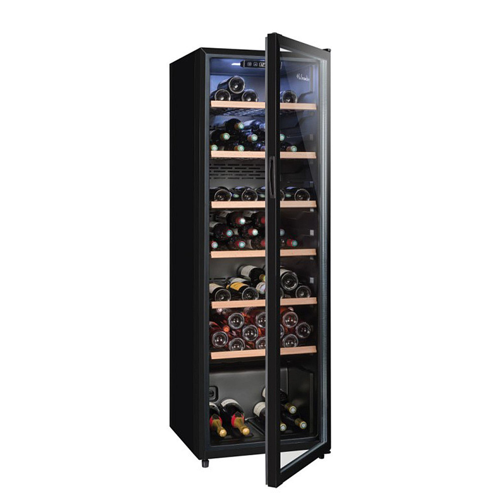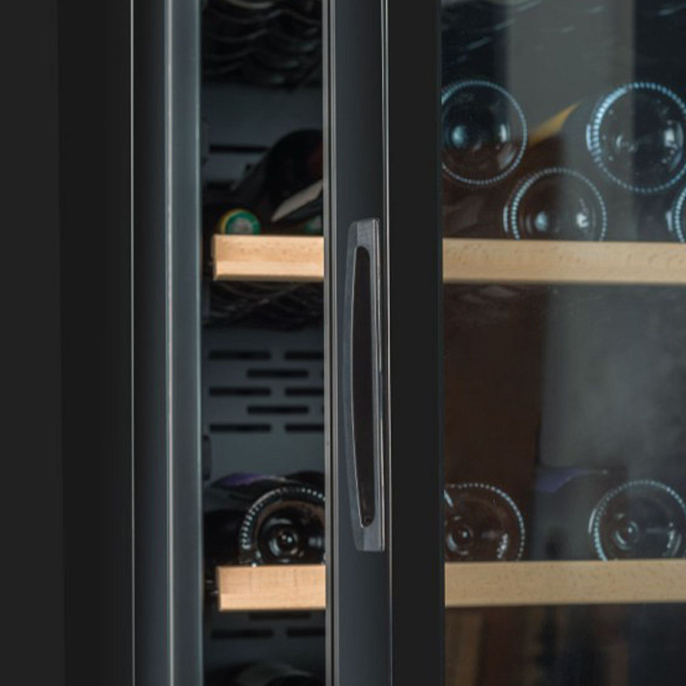 Lagringsskåp med helsvart och elegant design som ger perfekt överblick genom den UV-skyddande glasdörren. Den invändiga LED-belysningen lyser upp din vinsamling på ett smakfullt sätt, medan det energieffektiva kylsystemet skapar optimala förhållanden för långtidslagring.