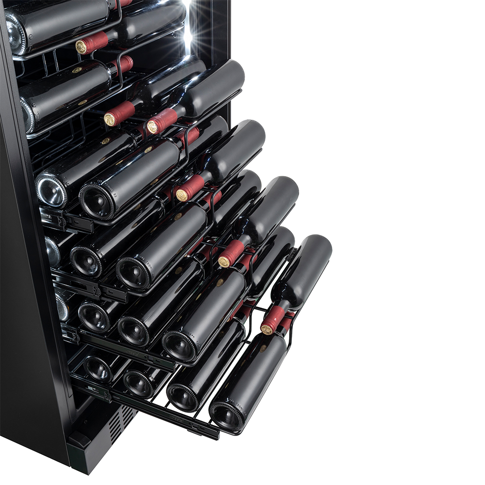Anpassad för alla typer av flaskor tack vare de teleskopiska stålhyllorna som kan dras ut helt. Hyllorna ger perfekt överblick över bordeaux-, bourgogne-, champagne- och rieslingflaskor samt vissa magnumstorlekar, vilket gör organiseringen enkel och tydlig.