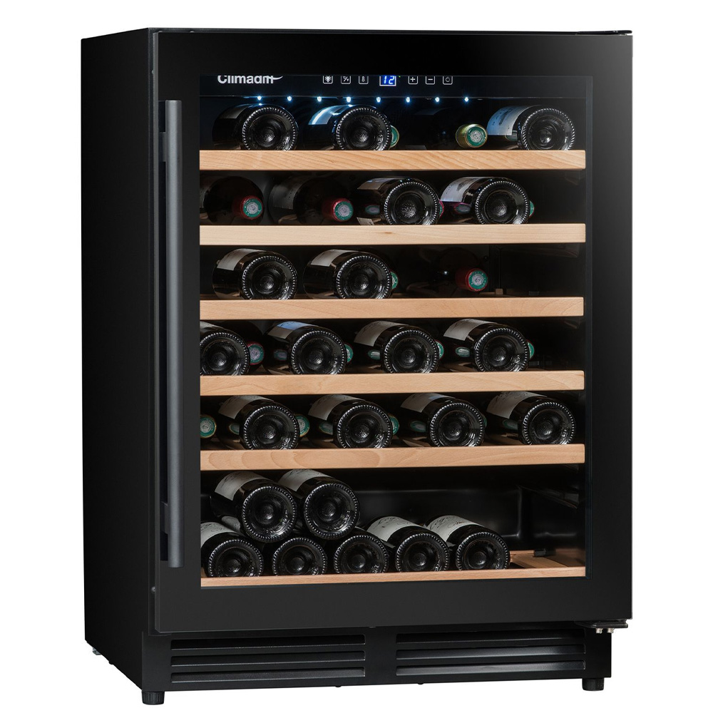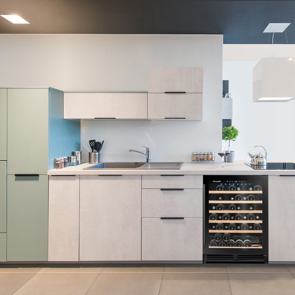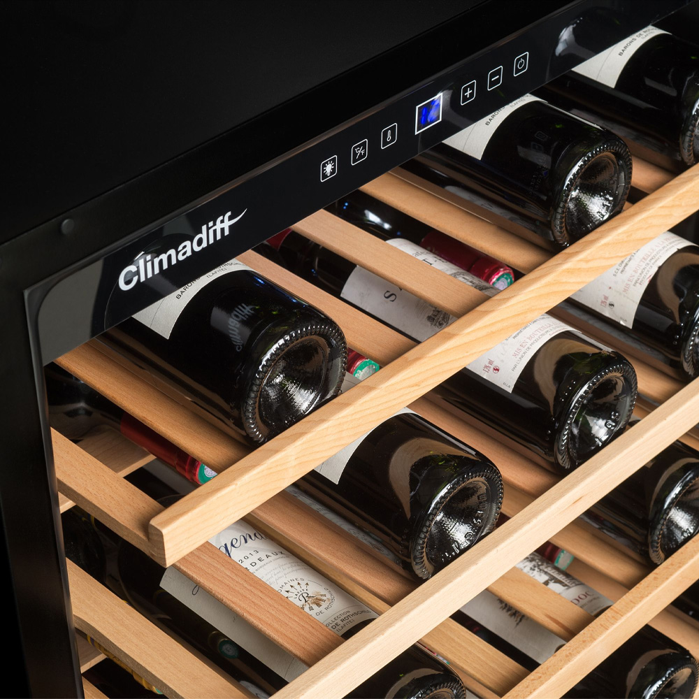 Glasdörren i 2-lagers härdat glas med UV-skydd skyddar vinet effektivt från skadligt ljus. Ett aktivt kolfilter renar luften i vinkylen och förhindrar att oönskade lukter tränger in, vilket bevarar vinets kvalitet över tid.