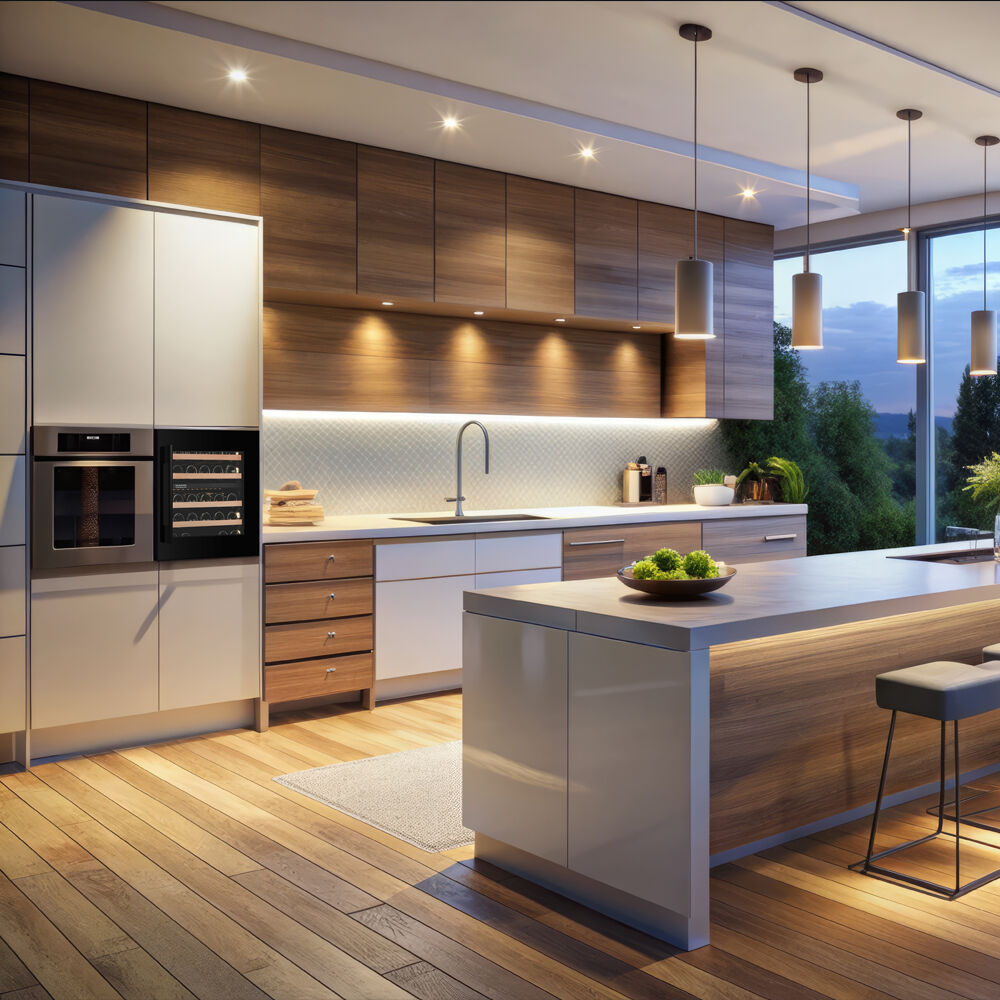 Teleskopiska trähyllor med stämningsfull LED belysning