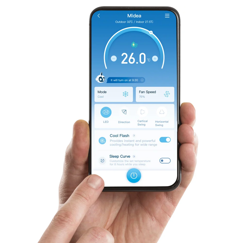 Smart styrning för flexibel användning. Luftkonditioneringen kan styras via fjärrkontroll eller app. Det ger möjlighet att justera temperatur, fläkthastighet och driftläge med hög precision och full kontroll över inomhusklimatet.