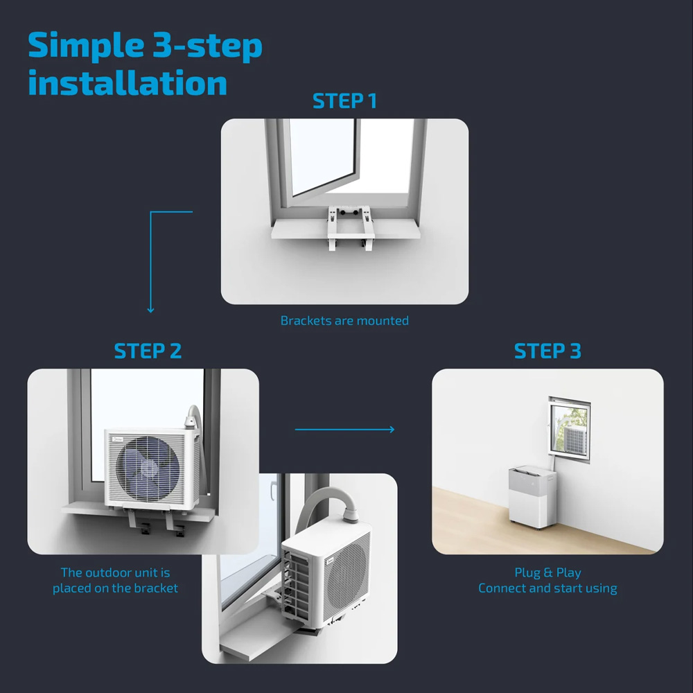 Enkel installation utan fasta ingrepp. PortaSplit är konstruerad för snabb användning direkt ur förpackningen. Utomhusenheten placeras smidigt i fönsterfäste och ansluts till inomhusenheten via en extra platt anslutning, vilket gör installationen diskret och enkel.