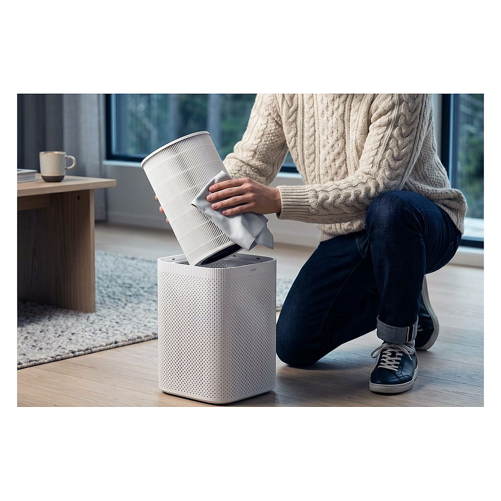 Avancerat filtreringssystem i tre steg. Filtersystemet består av förfilter, H13 HEPA filter och aktivt kolfilter. Förfiltret fångar upp större partiklar och skyddar huvudfiltren. HEPA filtret avlägsnar mycket fina partiklar kopplade till exempelvis pollen och damm, medan det aktiva kolfiltret reducerar gaser och lukter för en renare inomhusluft.