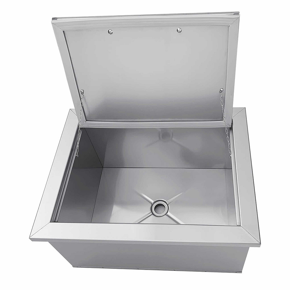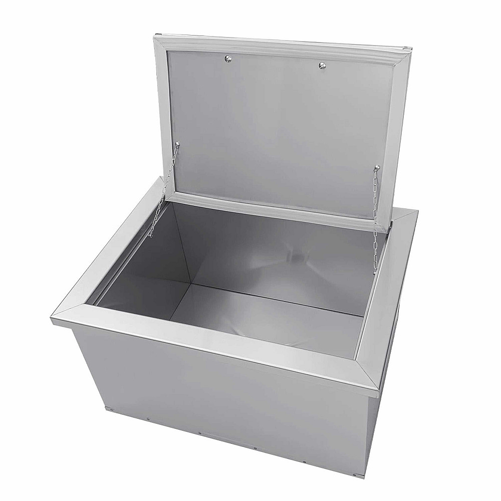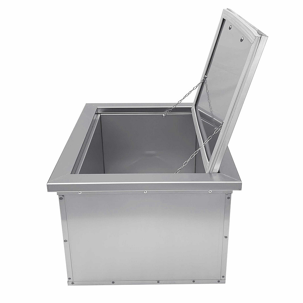 Specifikationer. Inbyggd isbehållare från Myoutdoorkitchen Built in serie. Tillverkad i rostfritt stål 304 SS med isolering i dubbla lager. Volym 48,1 liter. Mått 61 x 46 x 33 cm bredd x höjd x djup. Vikt 18,6 kg. Utrustad med rostfritt lock med handtag och avtappningsplugg för enkel rengöring.