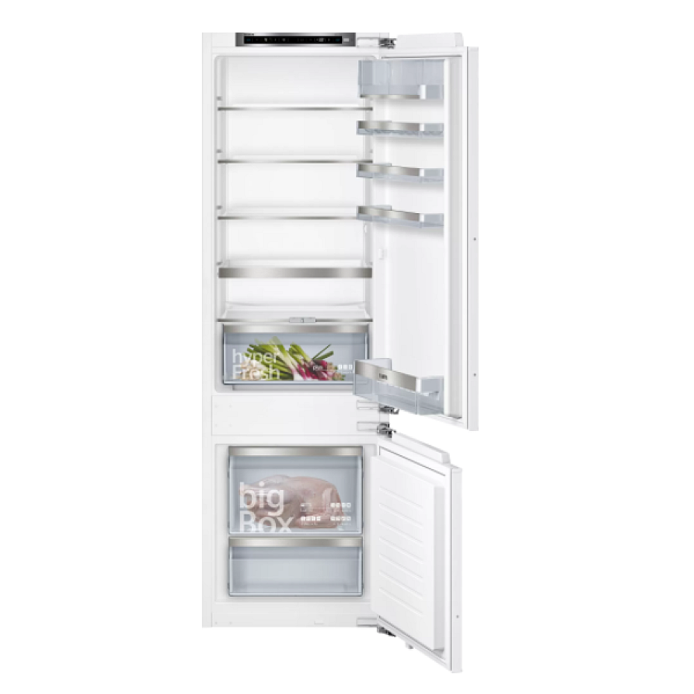Kombinerad kyl/frys för inbyggnad med lowFrost och hyperFresh plus-låda som håller frukt och grönsaker fräscha upp till dubbelt så längre.