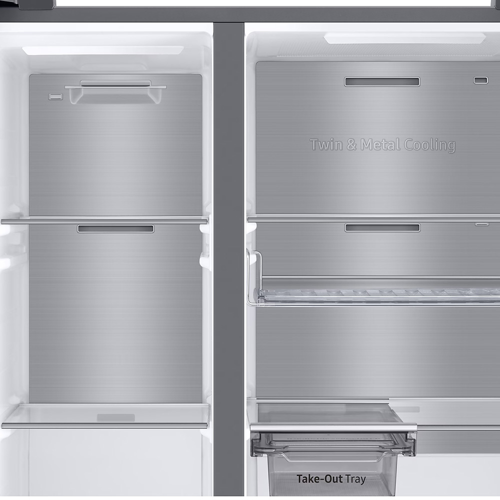 Samsung RS8000C är utrustad med Twin Cooling Plus, en avancerad kylteknik som optimerar temperatur och luftfuktighet i både kyl och frys med oberoende förångare och fläktar. Detta bevarar matens fräschhet längre och förhindrar att lukter blandas, vilket säkerställer att maten alltid smakar som den ska.