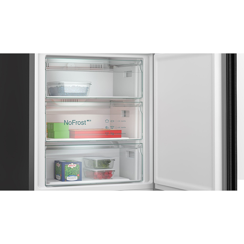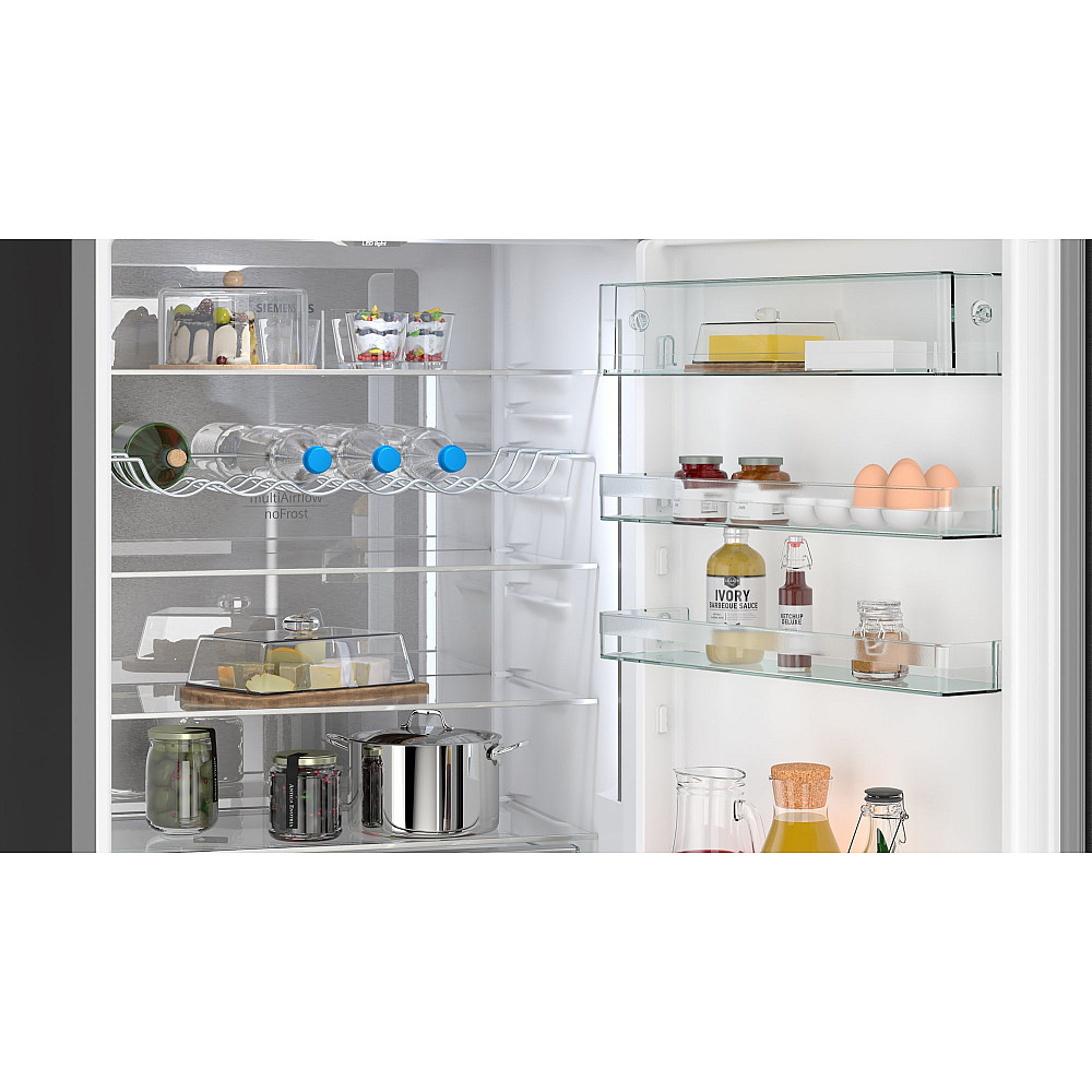 Siemens iQ700 kombinerad kyl och frys KG49NSBBF på 203 x 70 cm i svart matt design med satinerat glas kombinerar exklusiv estetik med avancerad teknik hyperfresh box håller frukt och grönsaker fräscha längre medan hyperfresh 0 °c-zonen skapar en optimal miljö för kött och fisk total nofrost-teknologin förhindrar isbildning och eliminerar behovet av manuell avfrostning vilket ger bekvämare användning multiAirflow-systemet med metallklädd bakre vägg säkerställer jämn luftcirkulation och stabil temperatur i hela kylen vilket bidrar till längre hållbarhet för livsmedel den intelligenta inverterkompressorn justerar temperaturen noggrant för energieffektiv drift och optimal kylprestanda den svarta satinerade glasdörren ger en modern och stilren touch till köket och gör kylen till ett designmässigt blickfång siemens kg49nsbbf är den perfekta lösningen för den som söker en rymlig högpresterande och elegant kyl och frys anpassad för det moderna hemmet