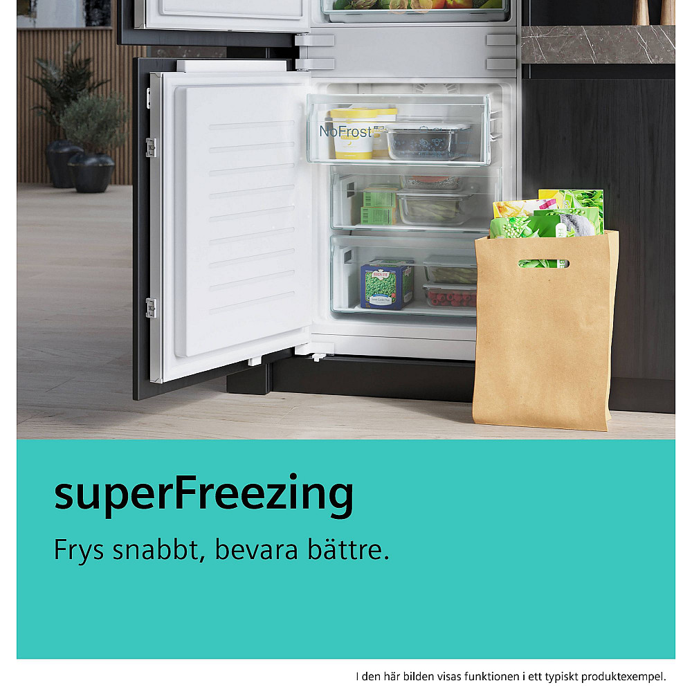 Har du veckohandlat och vill inte att dina nya frysvaror ska påverka din redan frysta mat? Med superFreezing sänks temperaturen i frysen till minimitemperatur, så att maten du precis lagt in fryser snabbt och redan fryst mat förblir fryst. Det bästa är om du aktiverar superFreezing fyra till sex timmar innan du kommer hem med dina stora kassar. Med Home Connect-appen sänker superFreezing tillfälligt temperaturen, så att din mat kan frysas snabbare när du väl kommer hem. Kraftfull frysning i dina händer.