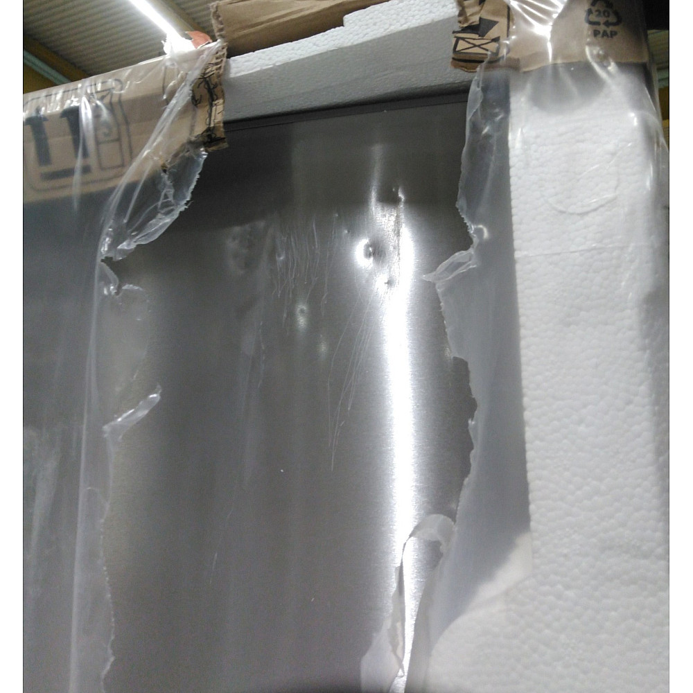 Ett exemplar nersatt i pris då det finns flertalet mindre bucklor och repor på kylskåpsdörrens övre högra hörn, se bild.