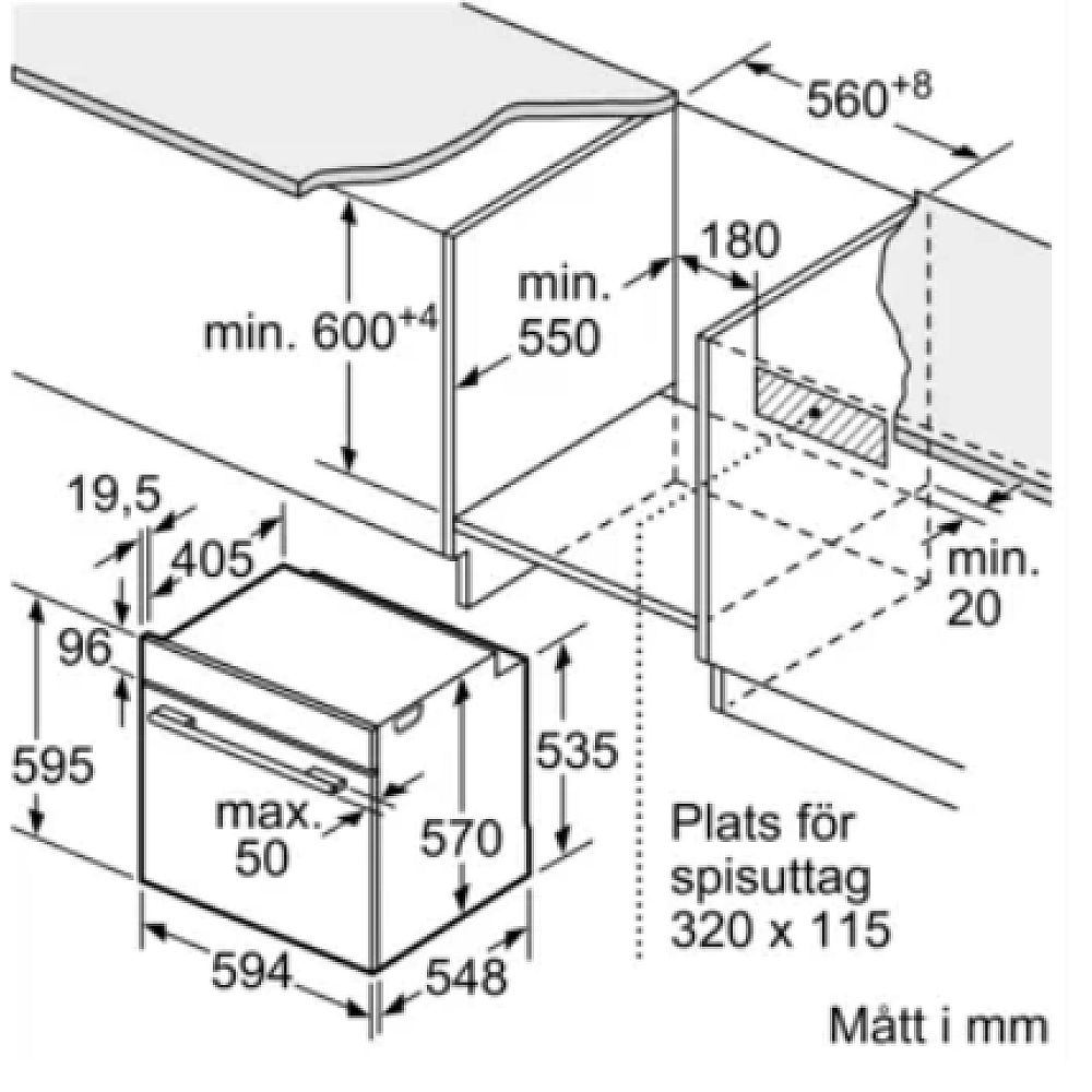 Värmeskyddad ugnslucka 50º C, uppmätt vid 180ºC över- /undervärme, efter 1 timme, mätpunkt mitt på ugnsluckan