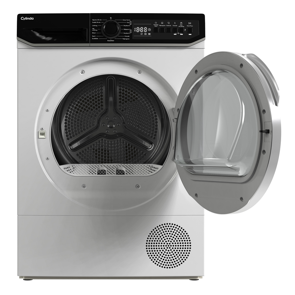 Cylinda TVP911G28E är framtagen för att vara både säker och bekväm. Den har barnspärr på panelen, barnsäkert lucklås och indikator för full kondensvattenbehållare. Tack vare anti-glidfötter står maskinen stabilt, och med måtten 596 x 550 x 845 mm passar den smidigt in i de flesta tvättutrymmen.