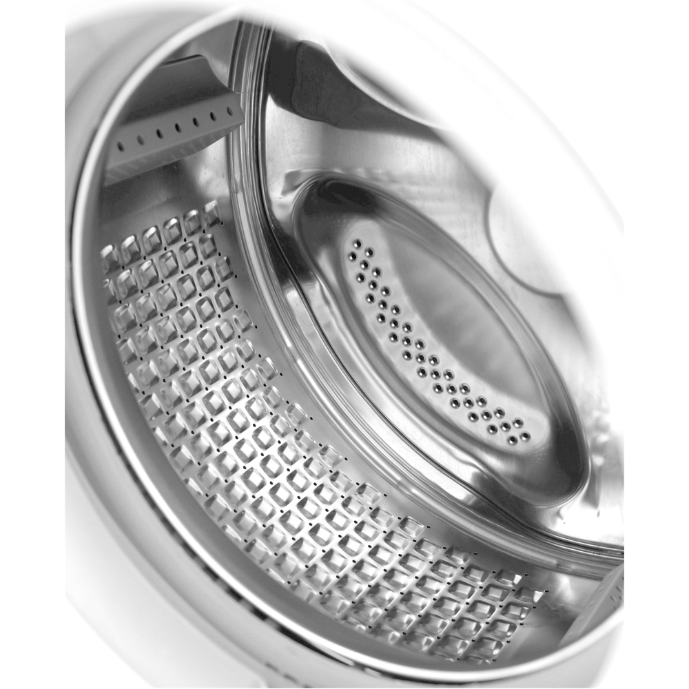 Skonsam multitrumma i rostfritt stål som skyddar kläderna. Säkerhet med barnspärr och vattenskyddssystem