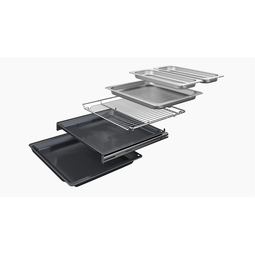 1 x Bakplåt i emalj, 1 x Galler, 1 x Långpanna, 1 x Ångbehållare, perforerad, storlek XL, 1 x Svamp, 1 x Ångbehållare, perforerad, storlek M, 1 x Ångbehållare, operforerad, storlek M