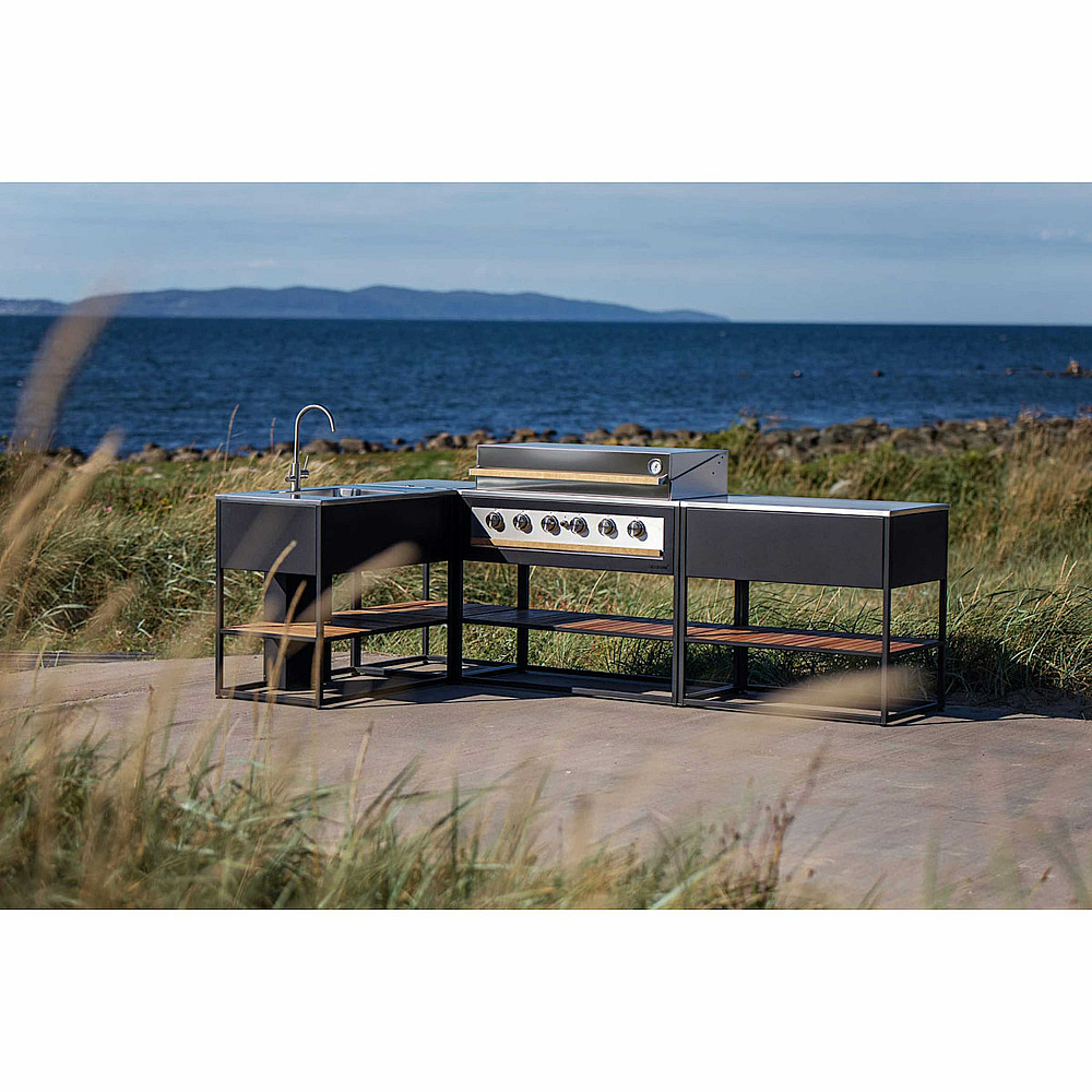 Exklusiv hörnmodul med stilren skandinavisk formgivning. Hörnmodul Skeldervik Stainless Countertop kombinerar raka linjer med funktionell design i hög kvalitet. Den svarta sidenmatta ytan tillsammans med rostfri toppskiva skapar en avskalad och elegant helhet som passar i alla typer av utemiljöer.