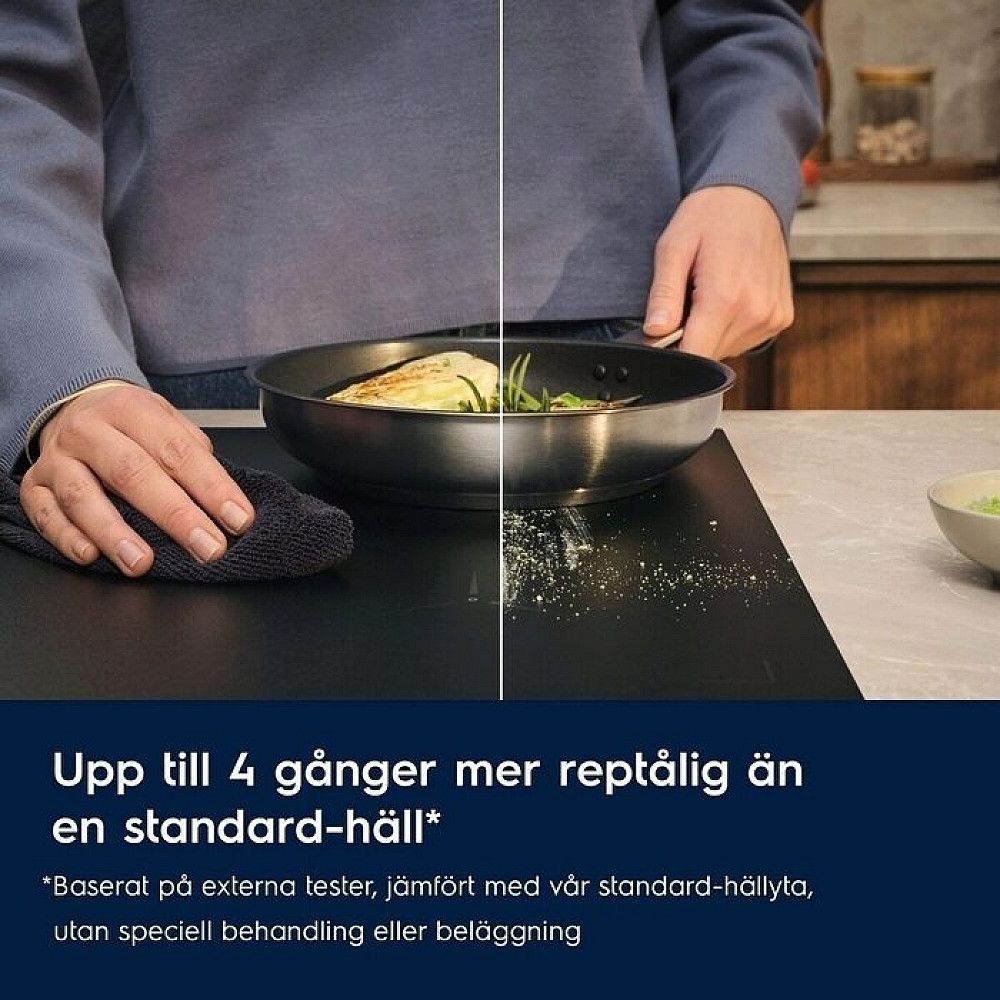 Reptålig SaphirMatt design. Den stilrena mattsvarta ytan i SaphirMatt glas ger ett exklusivt utseende samtidigt som den är utvecklad för att vara mer reptålig än traditionella glashällar. Glaset kan ge upp till tio gånger högre motstånd mot repor och minskar synligheten av fingeravtryck. Resultatet blir en häll som både ser elegant ut och är enkel att hålla ren i vardagen.