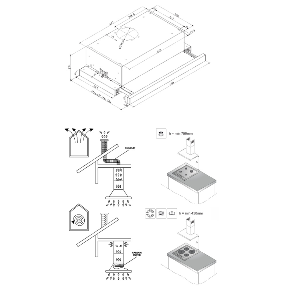 Fläkten har tre hastighetssteg som styrs enkelt med vippströmbrytare, och den kompakta storleken på 174 x 599 x 303 mm (HxBxD) gör den enkel att integrera i de flesta köksmiljöer. Med två metallfettfilter blir rengöringen smidig och hållbarheten längre.