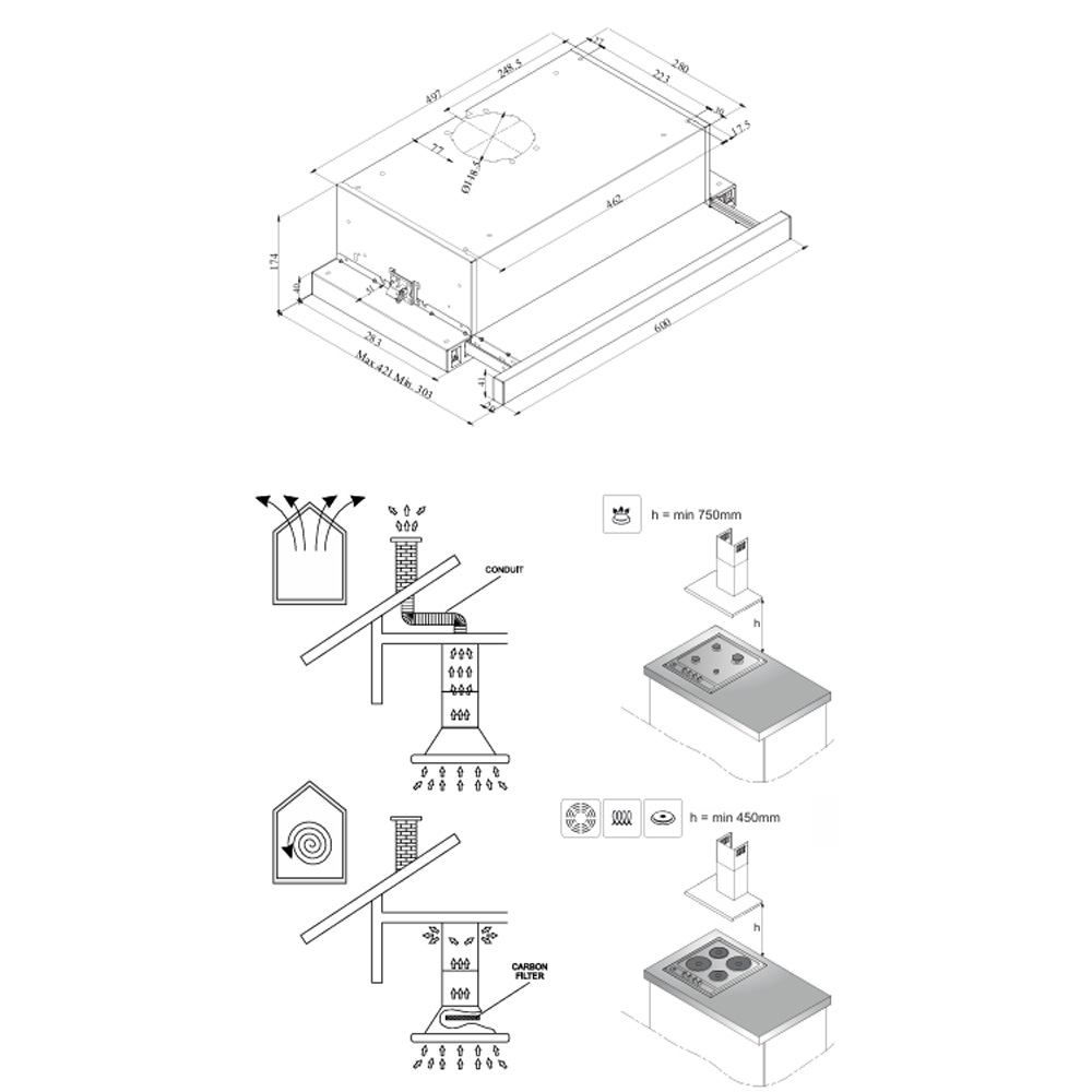 Fläkten är enkel att styra via vippströmbrytare och har tre hastighetssteg för flexibel användning. Tack vare sina kompakta mått på 174 x 599 x 303 mm (HxBxD) passar den i de flesta kök. Den är utrustad med två metallfettfilter som är lätta att rengöra och bidrar till lång hållbarhet.