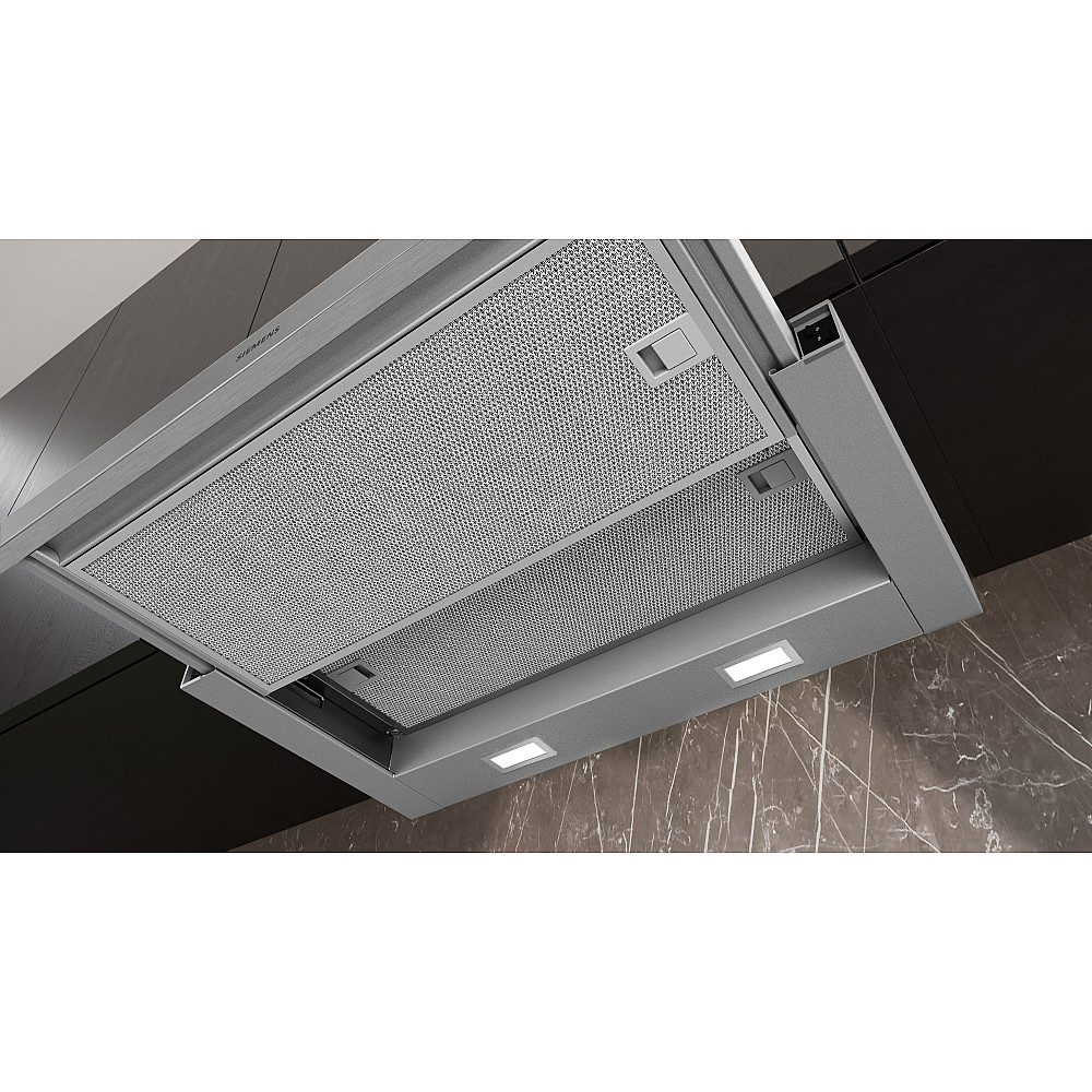 Denna utdragbara köksfläkt ur Siemens iQ100?serie är utvecklad för att ge effektiv ventilation utan att ta upp onödig plats. När fläkten inte används är den nästintill osynlig då den är integrerad i överskåpet, vilket ger ett diskret och enhetligt köksintryck.